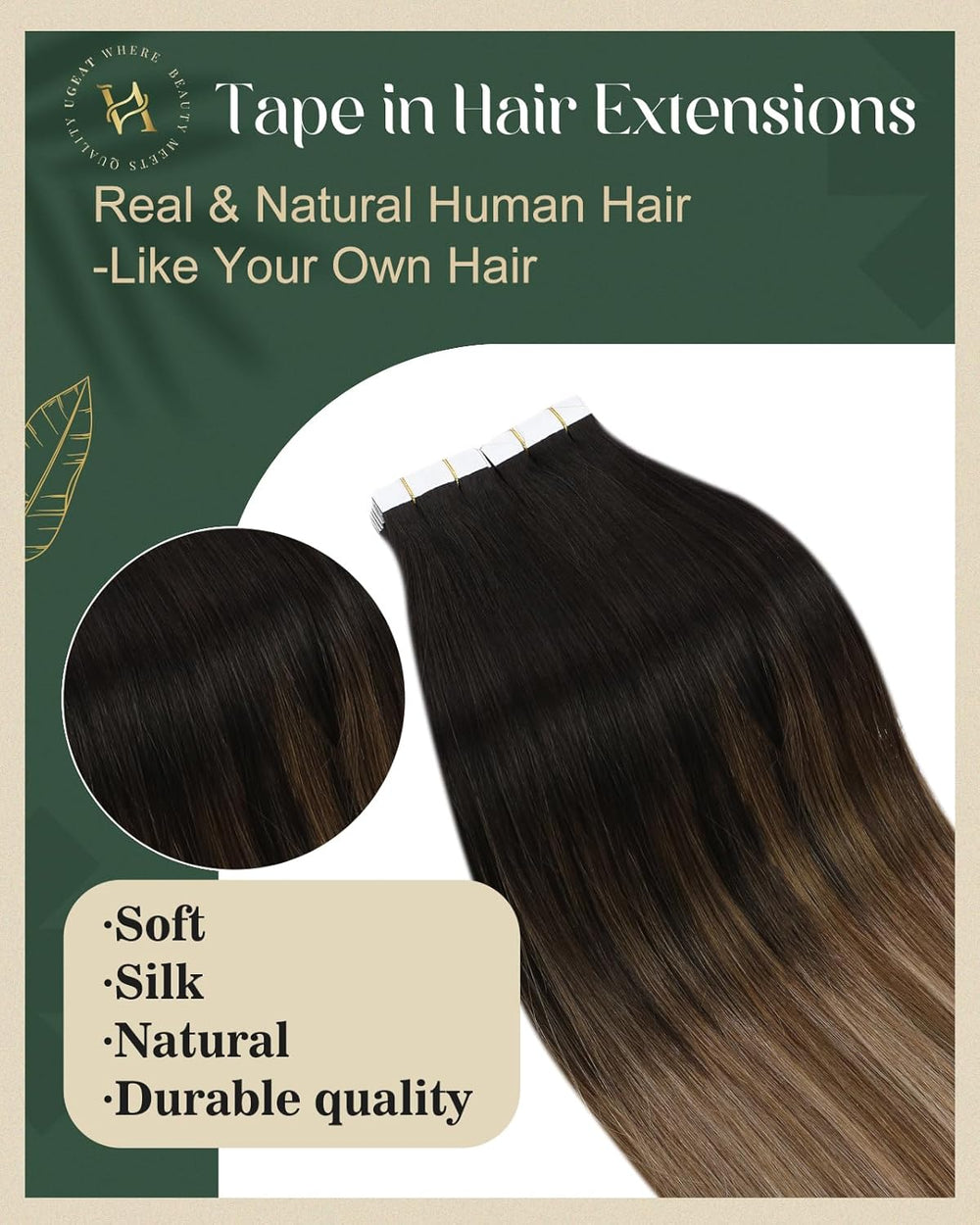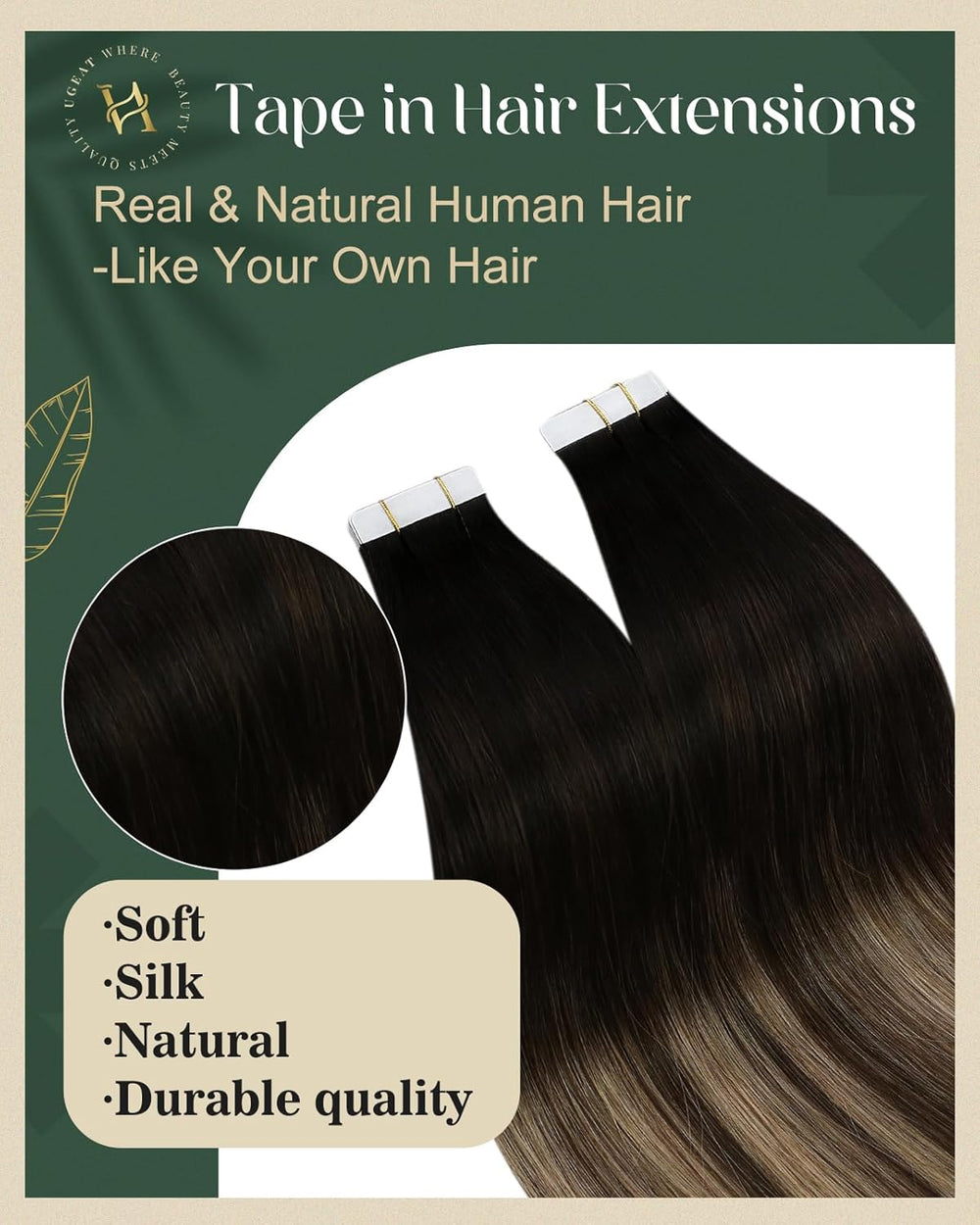 Ugeat 35cm Balayage Tape Extensions Echthaar Haarextension Echthaar Tape Dunkelstes Braun mit Mittel