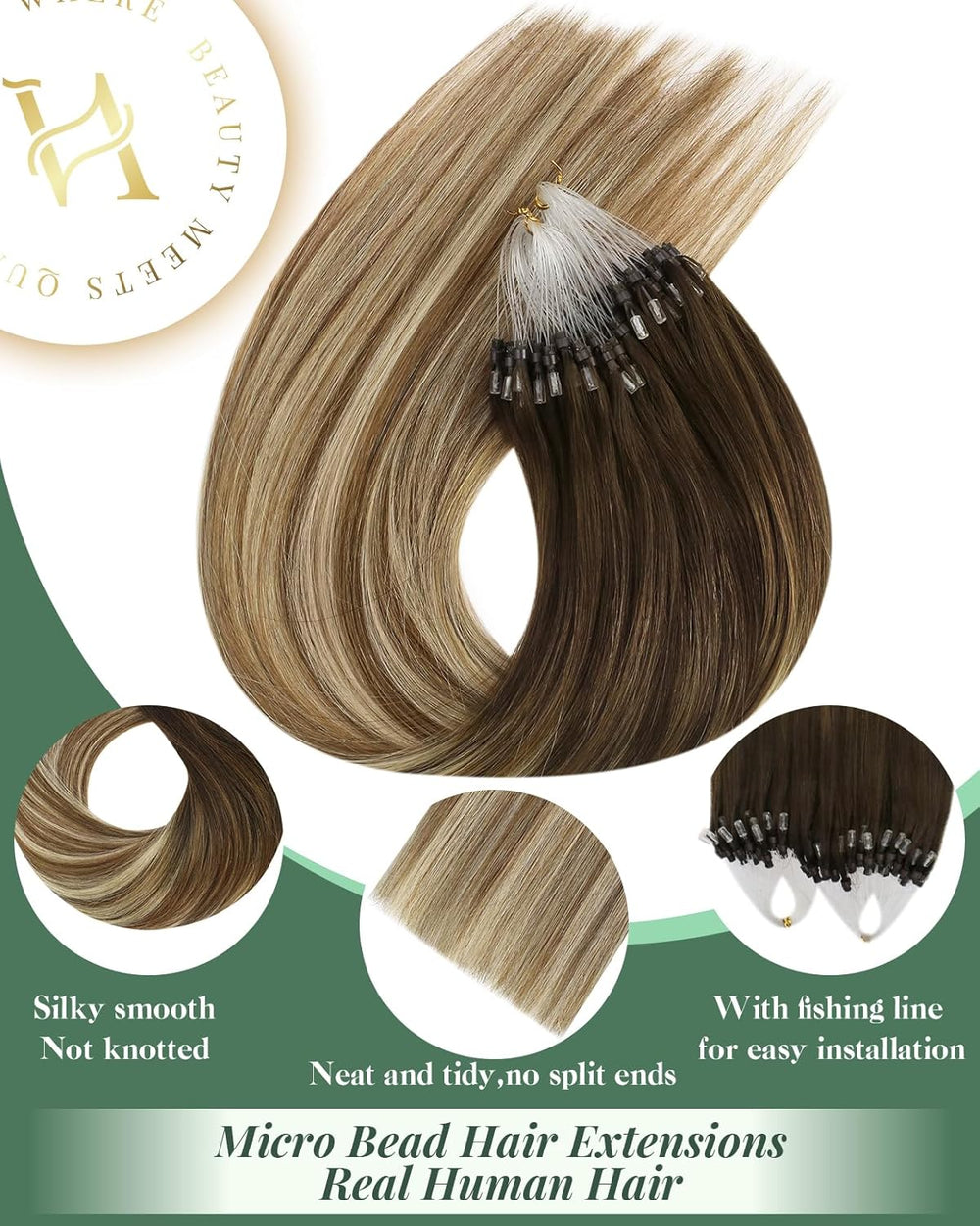 Ugeat 50cm Micro Loop Extensions Echthaar Balayage 9A/60/9A Hellbraun mit Platinblond Echthaar Verlä