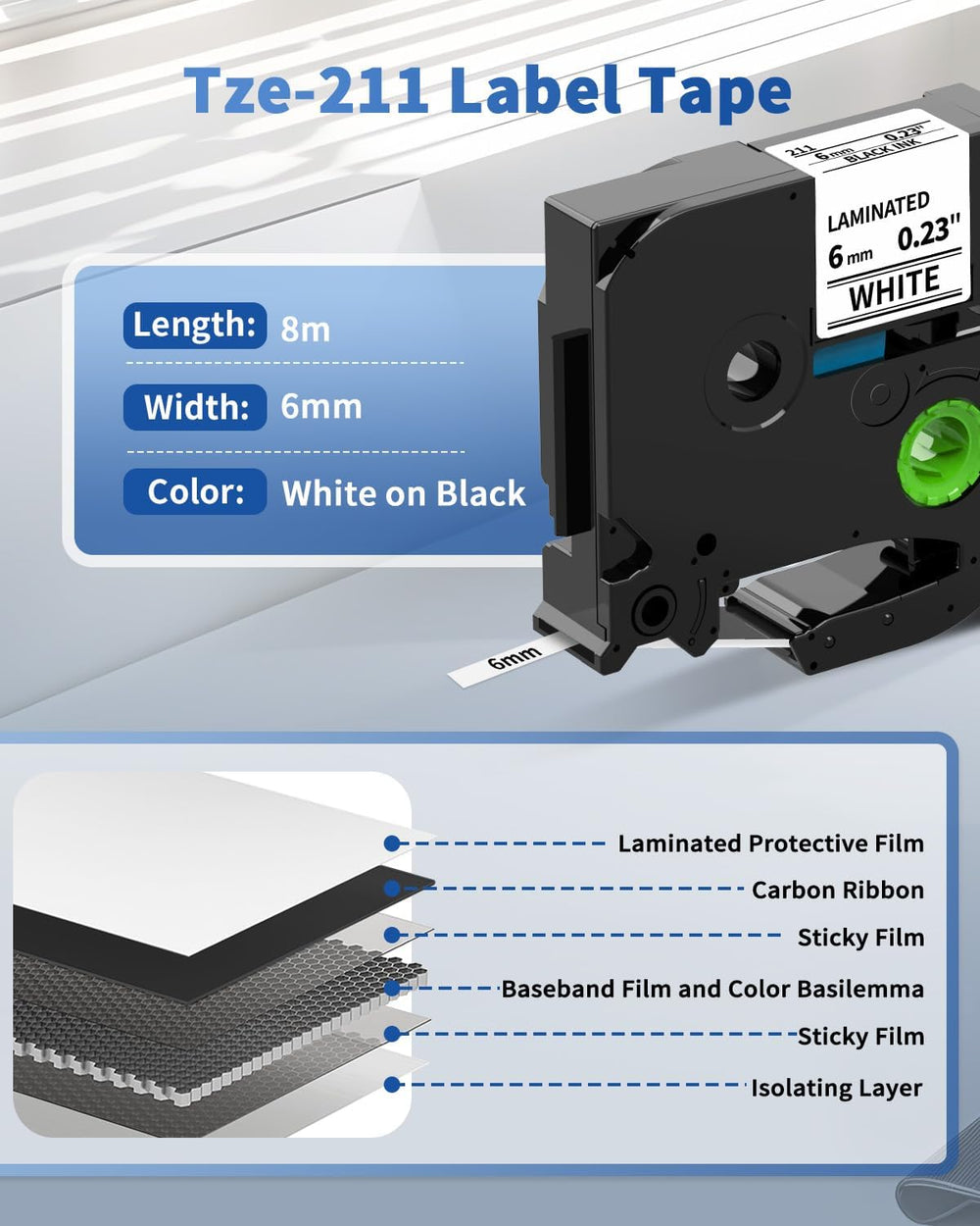 Upwinning Tze 211 Bänder 6mm Kompatibel mit Brother P-touch Bänder 6 mm x 8 m tze-211, Schwarz auf W