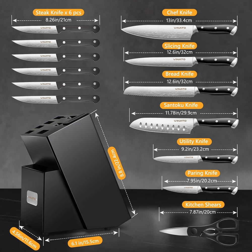 VINATO Messerblock, 14-TLG Messerblock mit Schärfer, Küchenmesser-Set mit Damast Optik, Messerblock