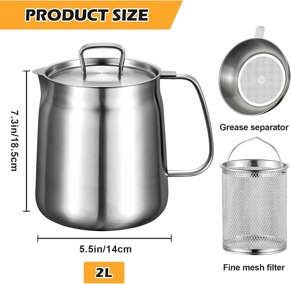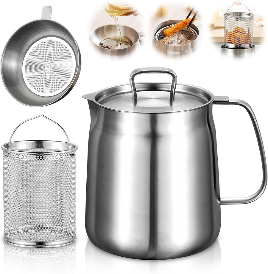 Fettbehälter für Speckfett, 2L Mini Frittiertopf Edelstahl mit Sieb Ölsieb-Topf Ölbehälter, Speckfet