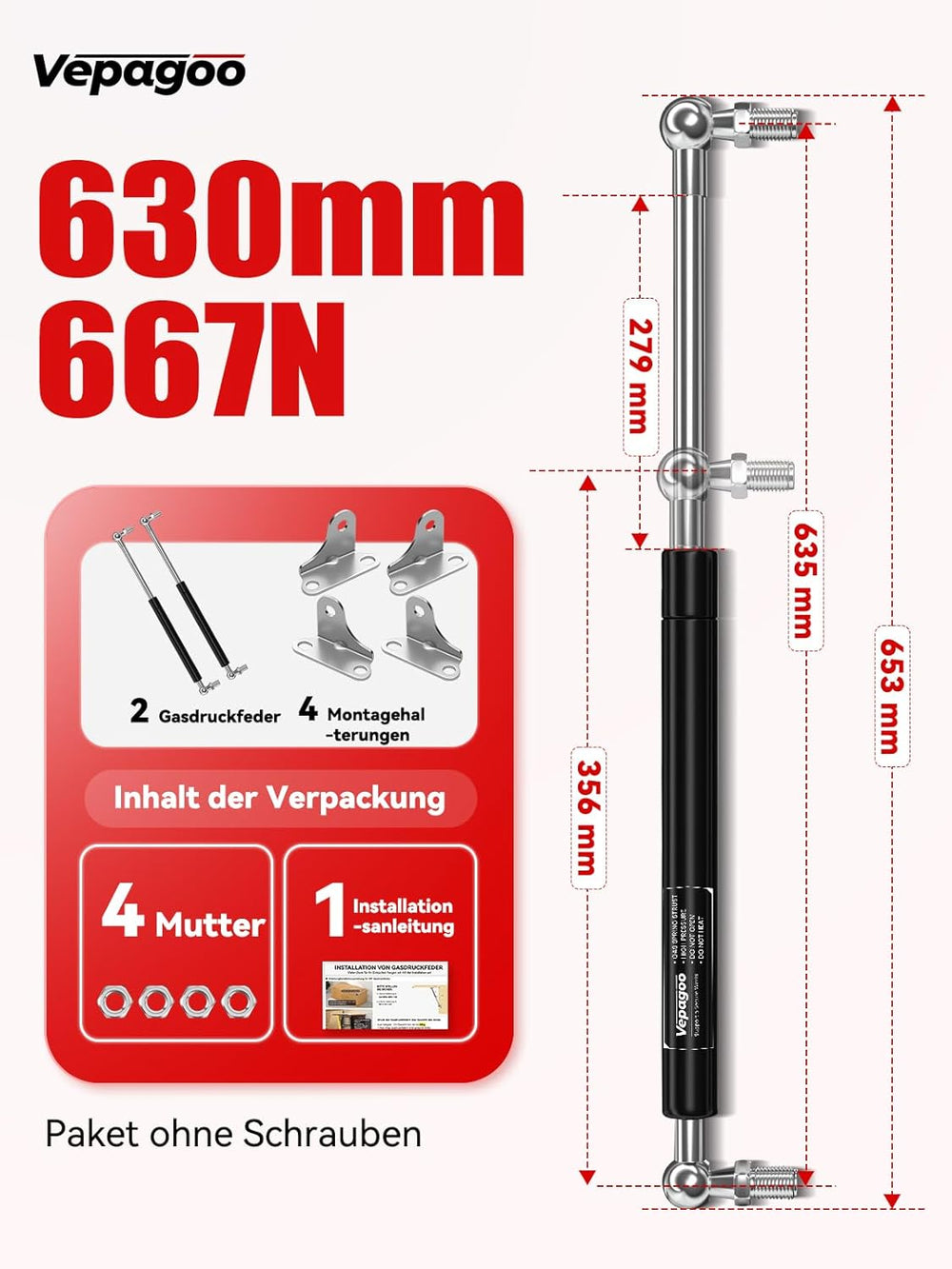 Vepagoo 600MM 300N 30KG Universal Gasdruckfeder Gasdruckdämpfer Schwerlast Gasdämpfer für Boot Bett