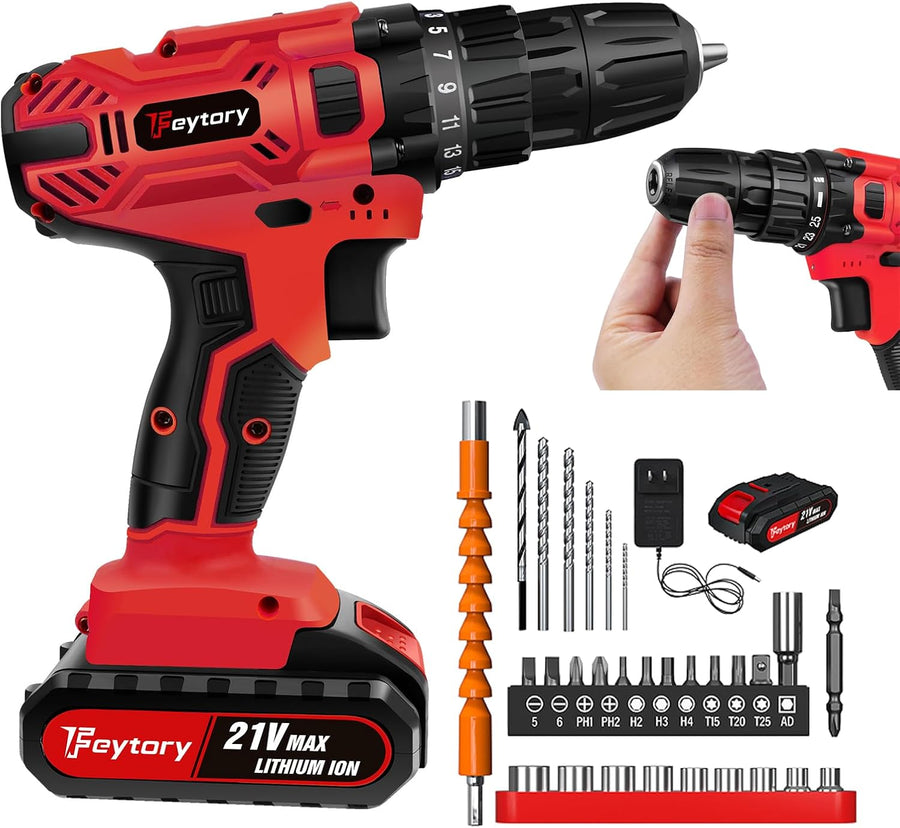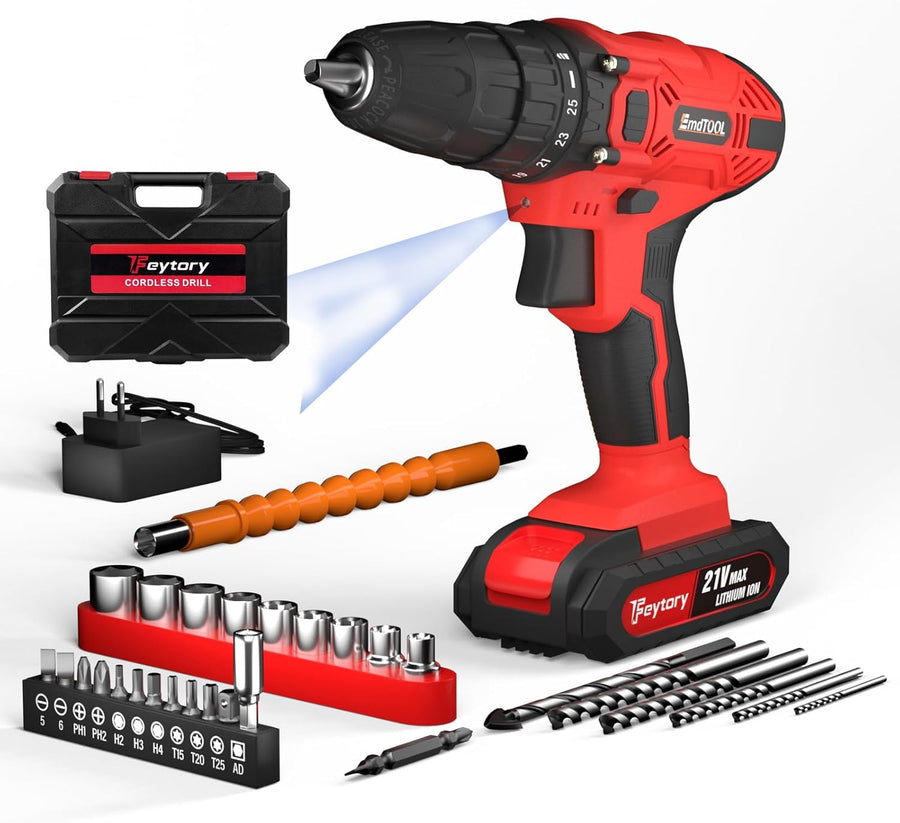 VickyHome Akku-Bohrschrauber 21V Bohrerset mit 1500mAh Akku, 25 + 1 Drehmomenteinstellung Bohrmaschi