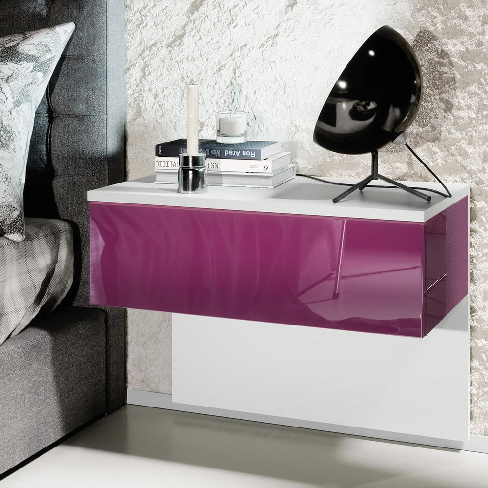 Vladon Nachttisch Sleep, Nachttischschrank mit Schublade zur Wandmontage, Weiss matt/Brombeer Hochgl