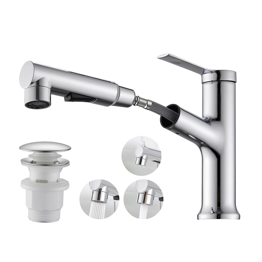 Wasserhahn Bad mit 3 Strahlarten ausziehbare Waschtischarmatur mit Ablaufgarnitur, Einhebelmischer A
