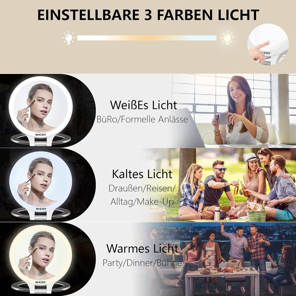 WEILY Schminkspiegel mit Beleuchtung, 10X/1X Vergrösserung Doppelseitiger Kosmetikspiegel mit 3 Farb