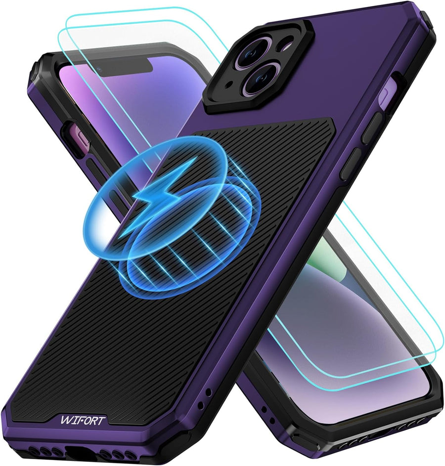 WIFORT Magnetisch Metall Hülle für iPhone 14 Plus Kompatibel mit MagSafe, mit 2 Stück Schutzglas, Mi