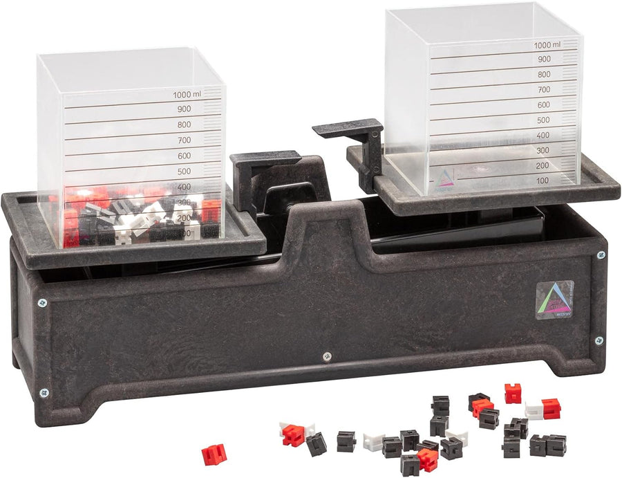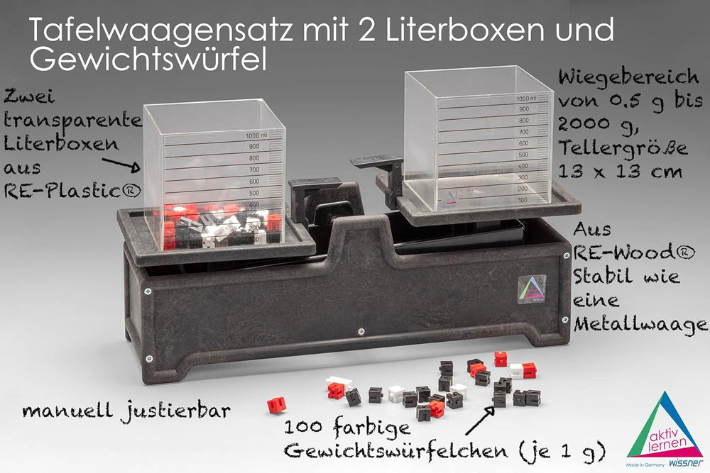 WISSNER 070120.000 aktiv Lernen-Tafelwaage mit 2 Literboxen und Gewichtswürfel-RE-Wood, Mehrfarbig