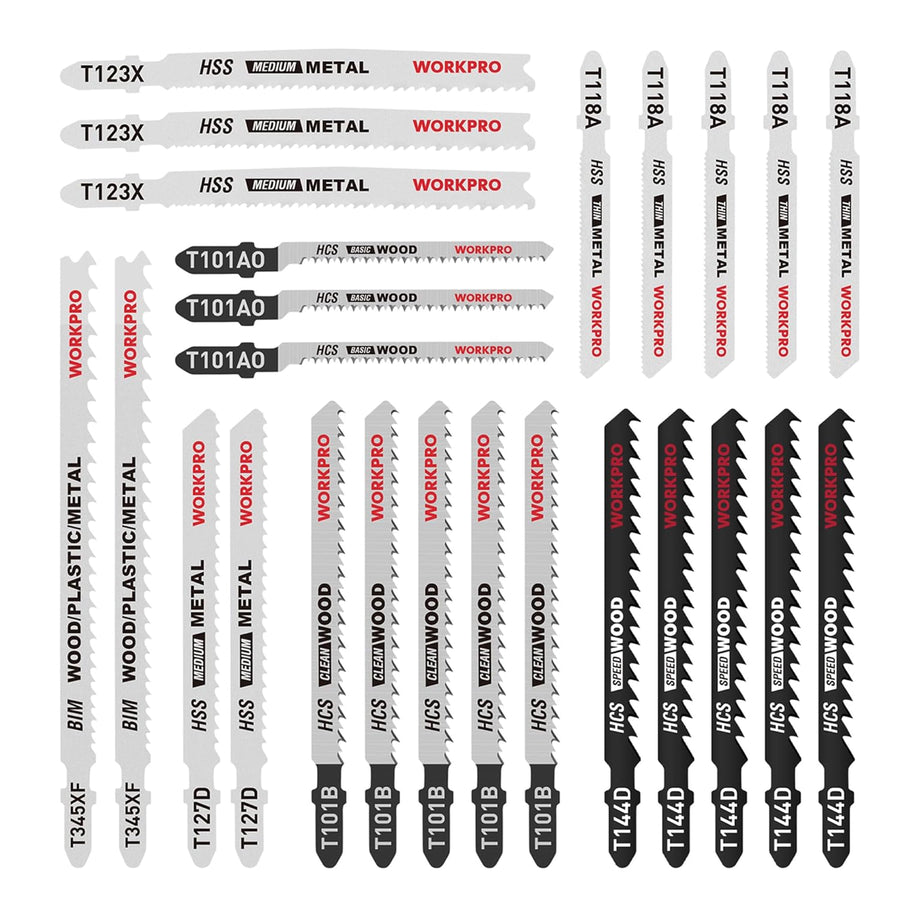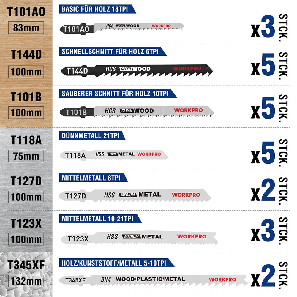 WORKPRO Professional Stichsägeblätter Set, 25tlg.T-Schaft Stichsägeblätter aus HSS/BIM/HCS für Holz,