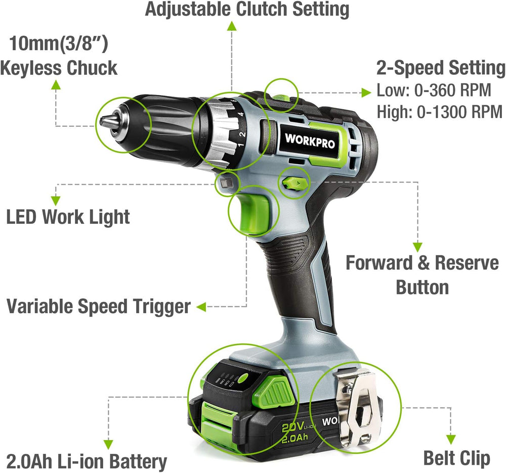 WORKPRO Akkuschrauber 18V/20V Akku-Bohrschrauber mit 16 Zubehör, Drehmoment 25NM und variable Drehza