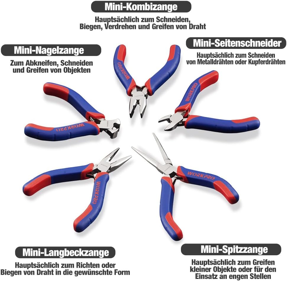 WORKPRO Mini-Zangen-Set, Schmuckzangen, 5-teilig, inkl. Linesman-Zange, Spitzzange, Seitenschneider,
