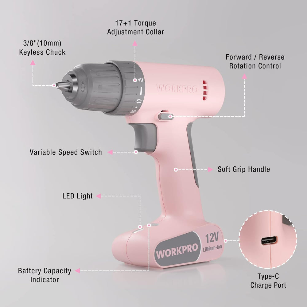 WORKPRO Akkuschrauber 12V, Akku Bohrschrauber 19NM Drehmoment, 3/8" Bohrfutter, 17+1 Drehmomenteinst