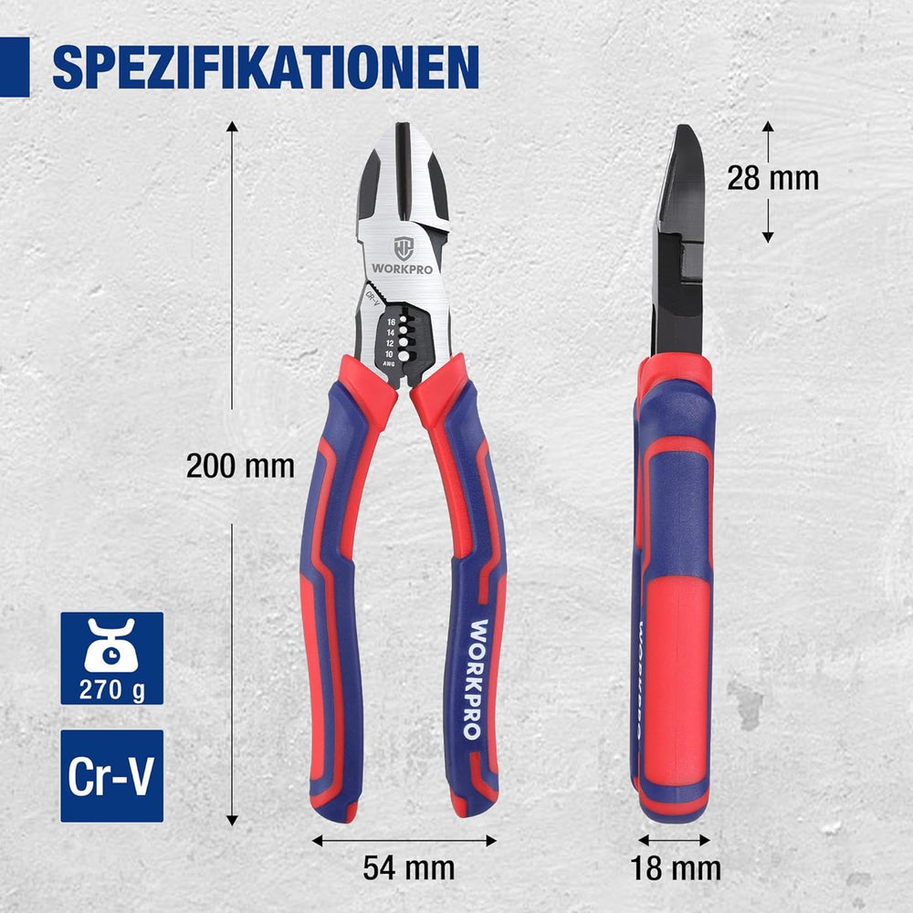 WORKPRO Seitenschneider Abisolierzange 2-in-1 Multifunktionale Zange Drahtschneider 200mm zum Abisol