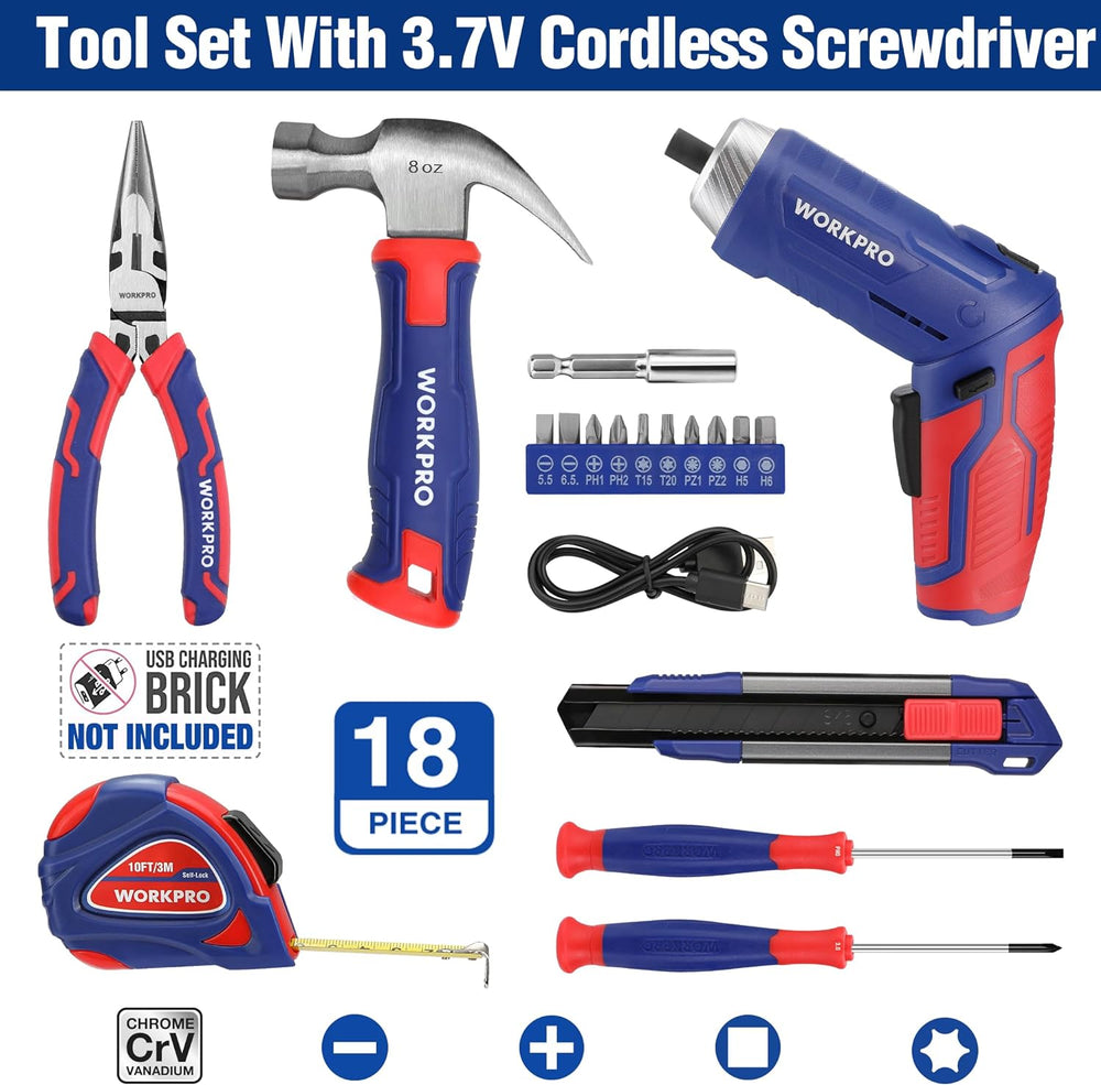 WORKPRO 18 tlg. Werkzeugset mit 3,7V USB C Akkuschrauber klein, Werkzeugkoffer gefüllt Werkzeugsatz