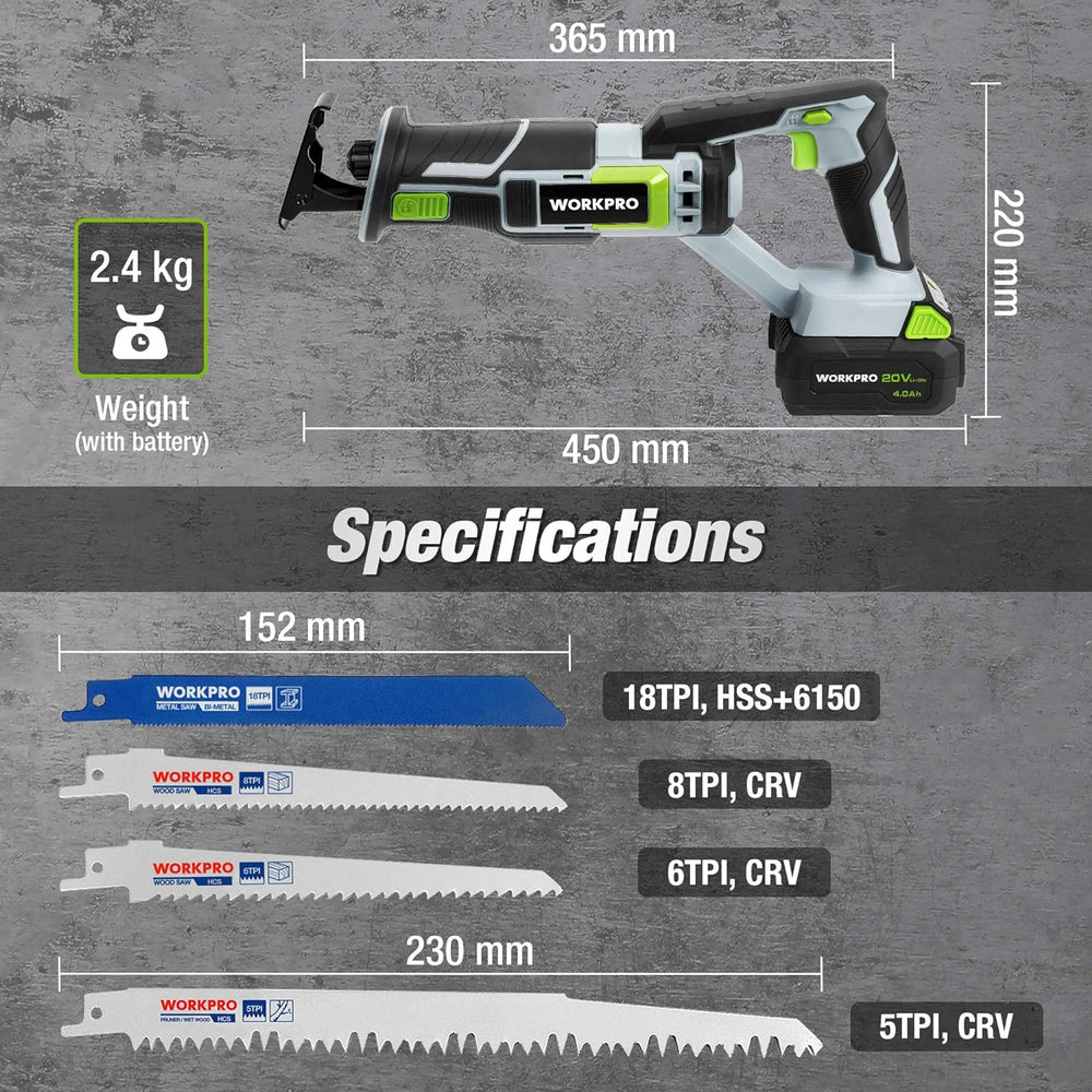 WORKPRO Akku Säbelsäge Kabellose Reciprosäge 20V 4,0 Ah Universalsäge mit 4 Sägeblätter für Holz&Met