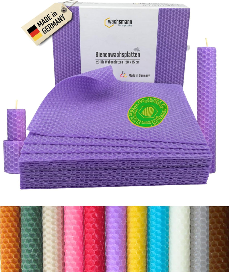 Wachsmann reines Bienenwachs aus Deutschland, lila flieder, 20 Bienenwachsplatten für Kerzen 20 x 15