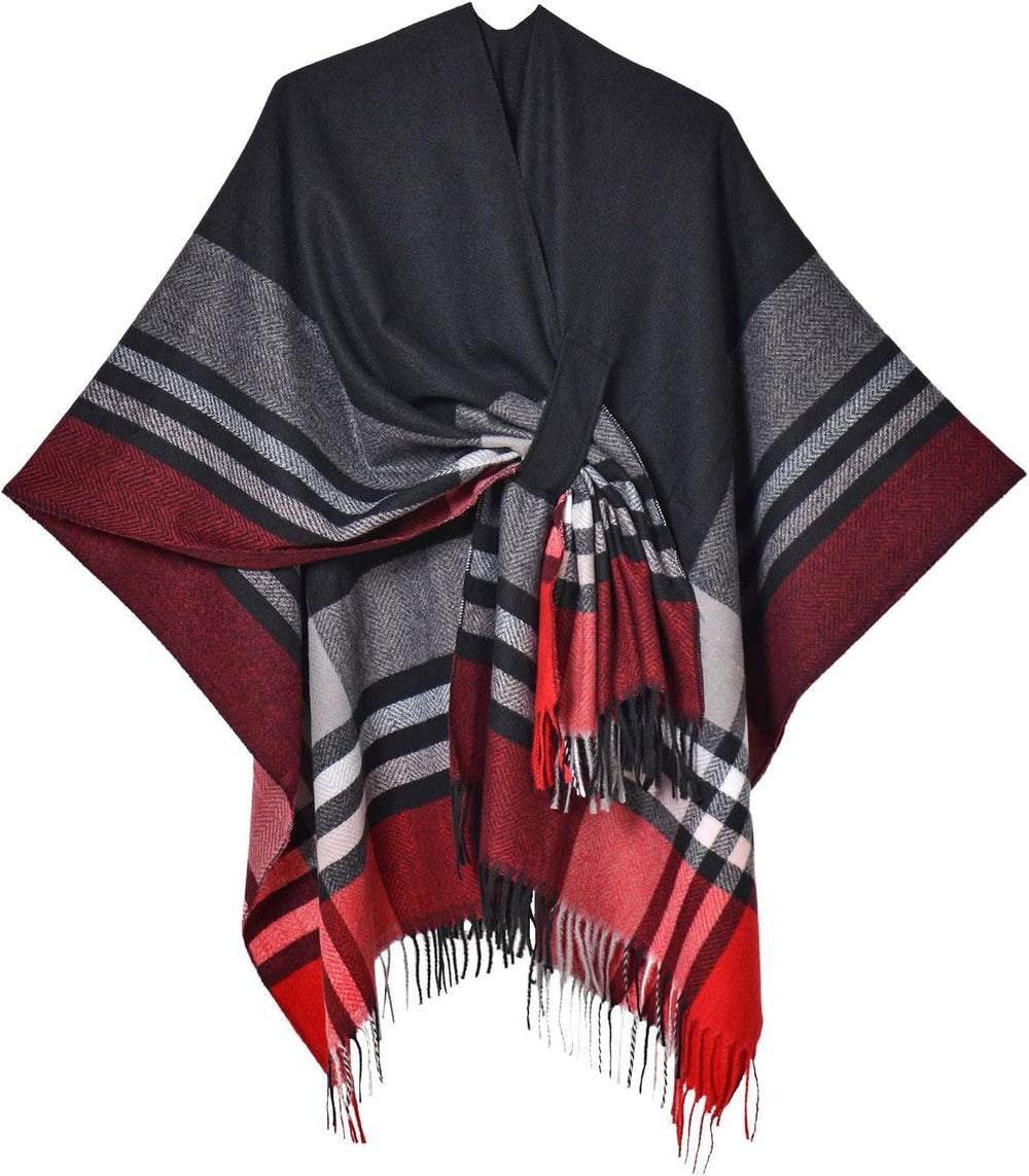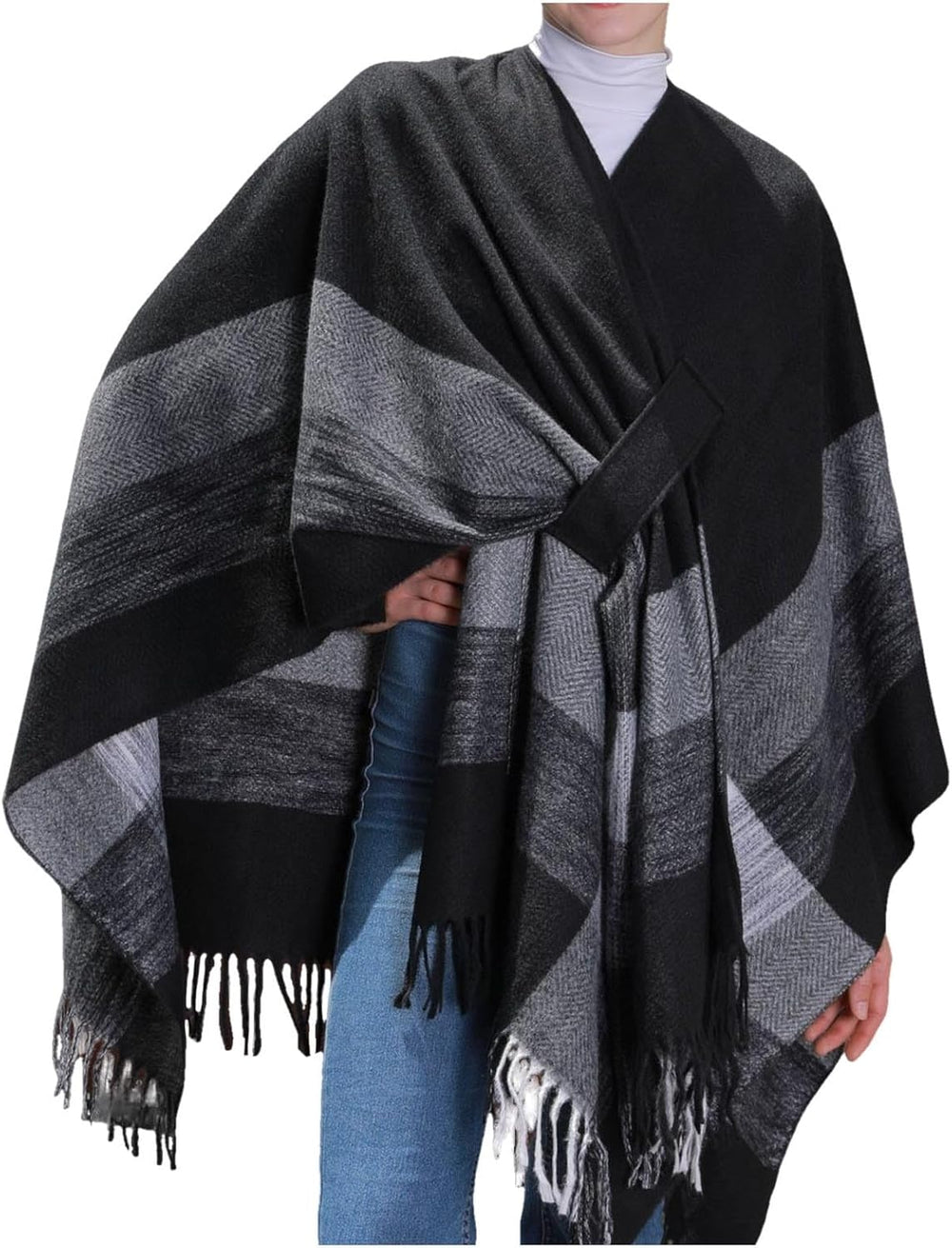 Eleganter Bequemer Damen Poncho Pullover mit Chevronstreifen und Fransen Poncho Cape Retro Cardigans