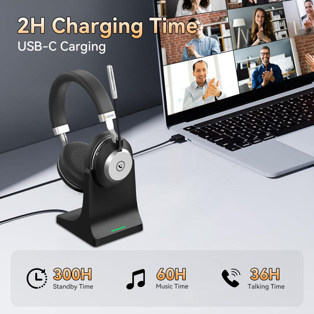 Wantek Wireless Business Headset mit Noise-Cancelling Mikrofon & Ladestation – Bluetooth 5.3 & 2.4GH