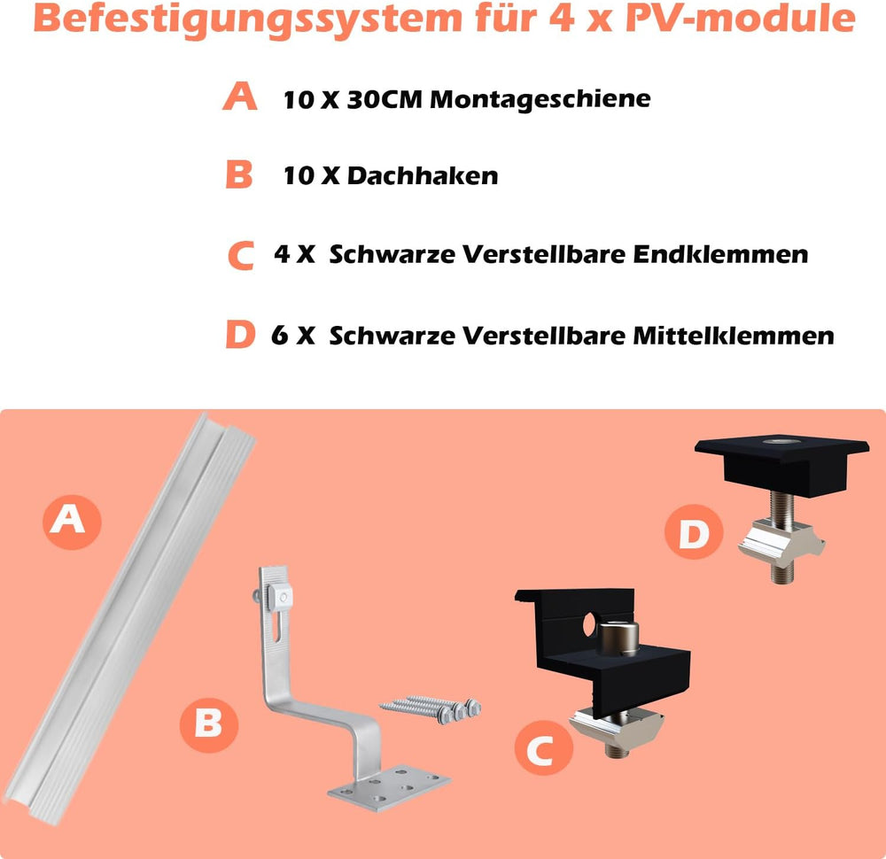 Photovoltaik Solar Halterung Ziegeldach Befestigungssystem 4 Module, Solarmodul Halterung Ziegeldach