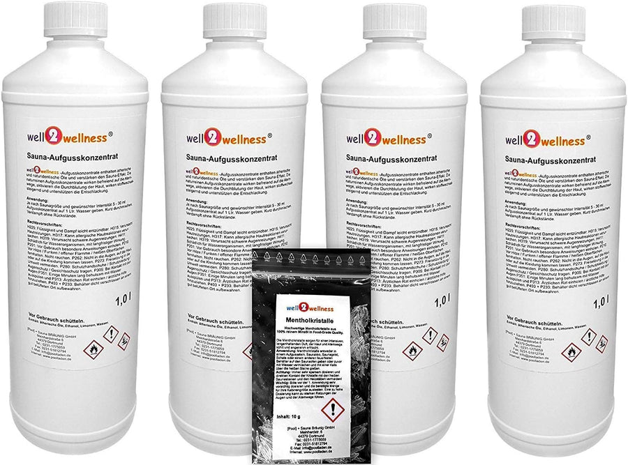 Saunaaufguss Set 4 x 1,0 l von well2wellness® + gratis 10g Mentholkristalle - freie Wahl aus über 60