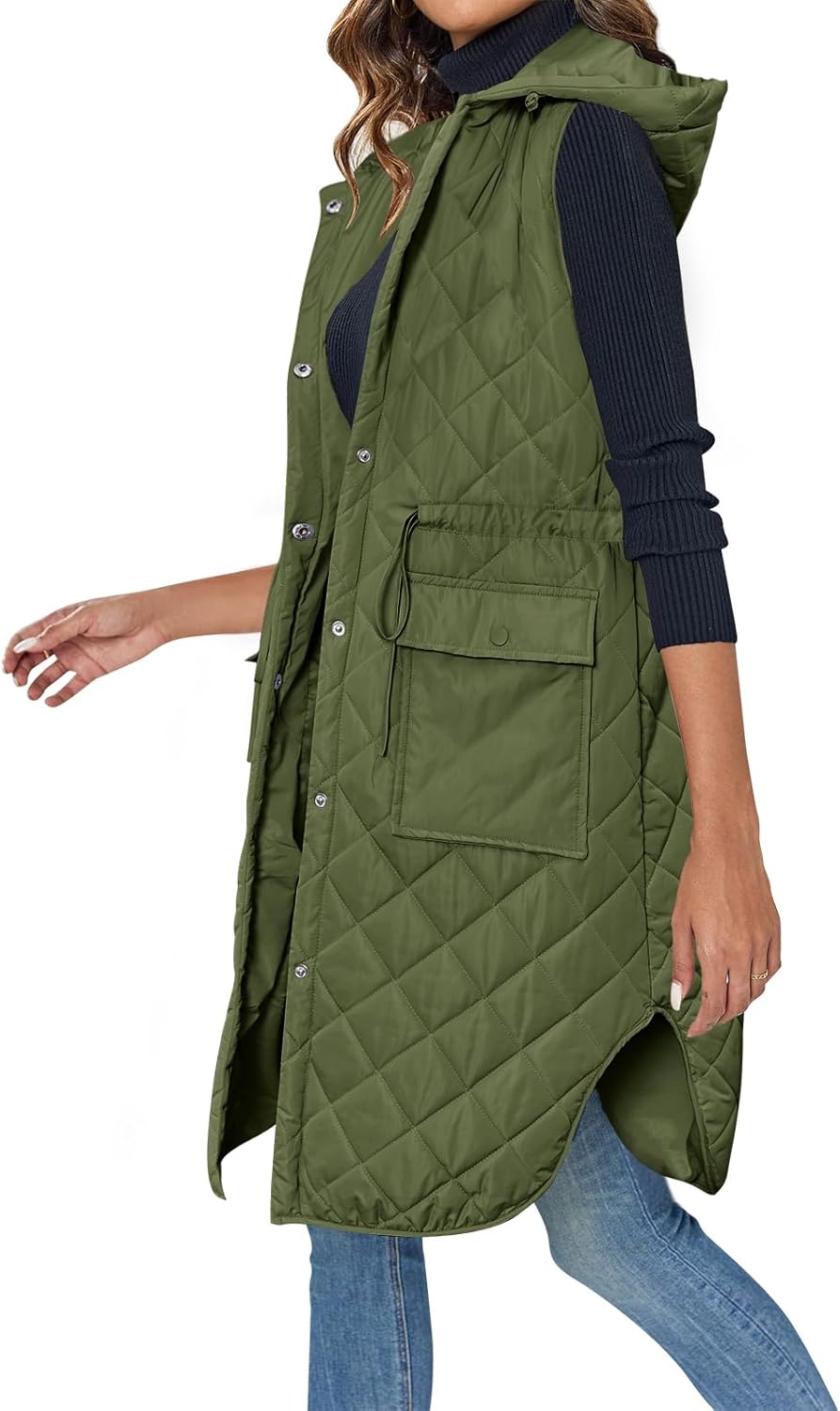 Wenrine Damen Weste Lang Ärmellose Winter Steppweste mit Kapuze und Taschen Casual M Armeegrün, M Ar