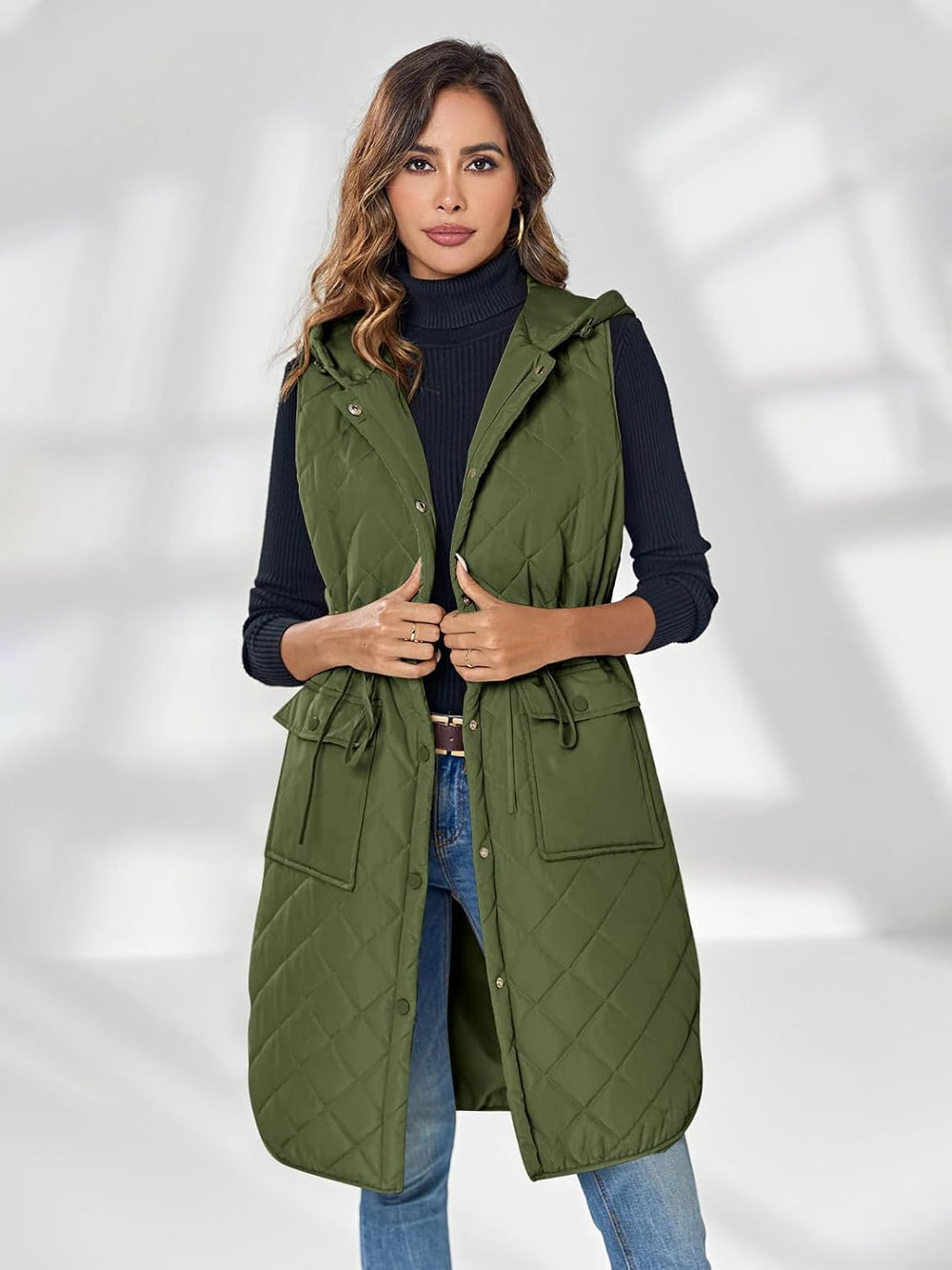 Wenrine Damen Weste Lang Ärmellose Winter Steppweste mit Kapuze und Taschen Casual S Armeegrün, S Ar