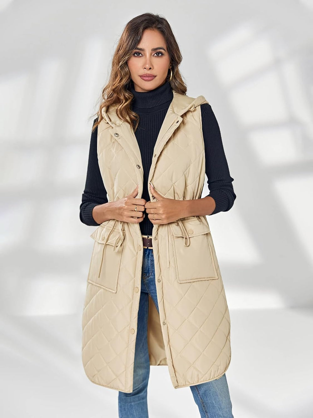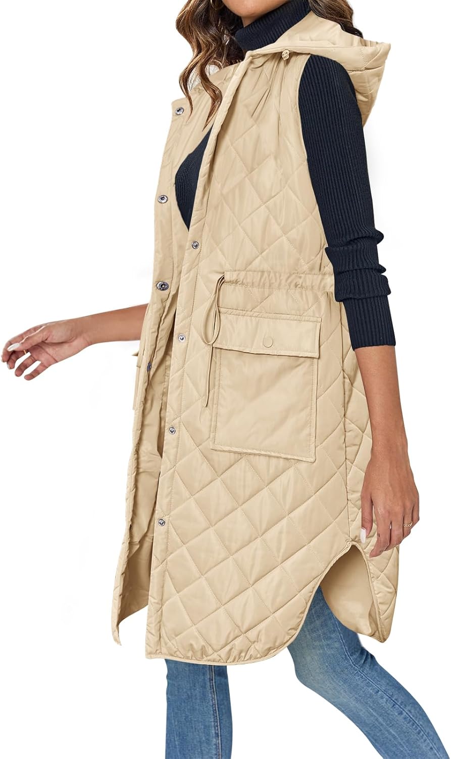 Wenrine Damen Weste Lang Ärmellose Winter Steppweste mit Kapuze und Taschen Casual S Khaki, S Khaki