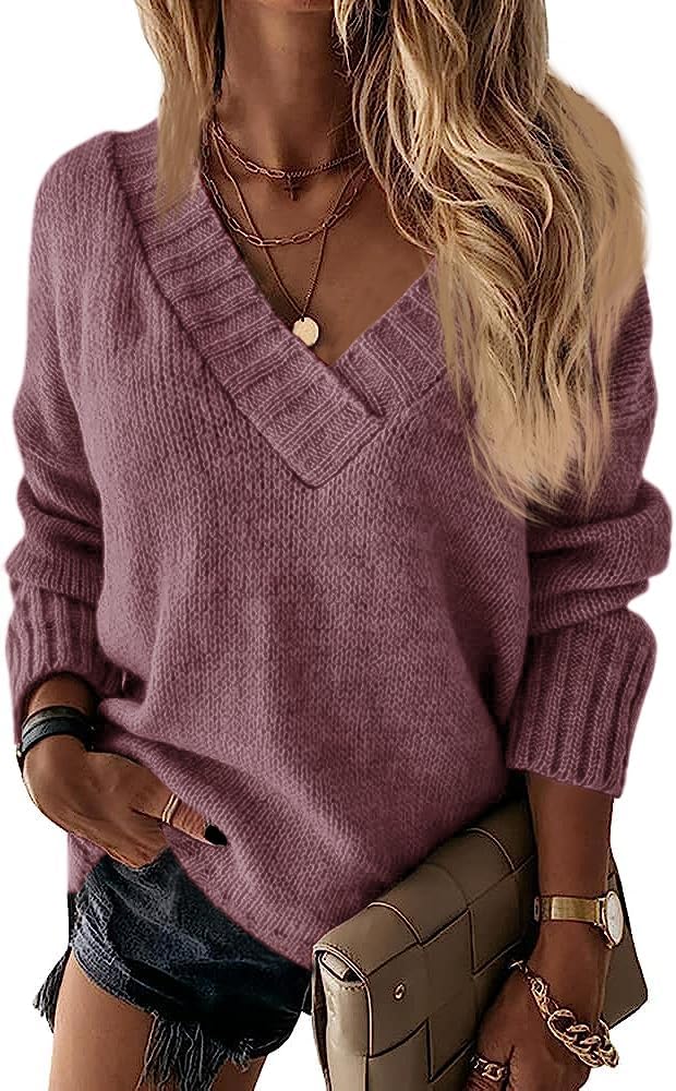 Wenrine Damen Pullover Winter Langarm V-Ausschnitt Strickpullover Sexy Lose Einfarbig M Violett, M V