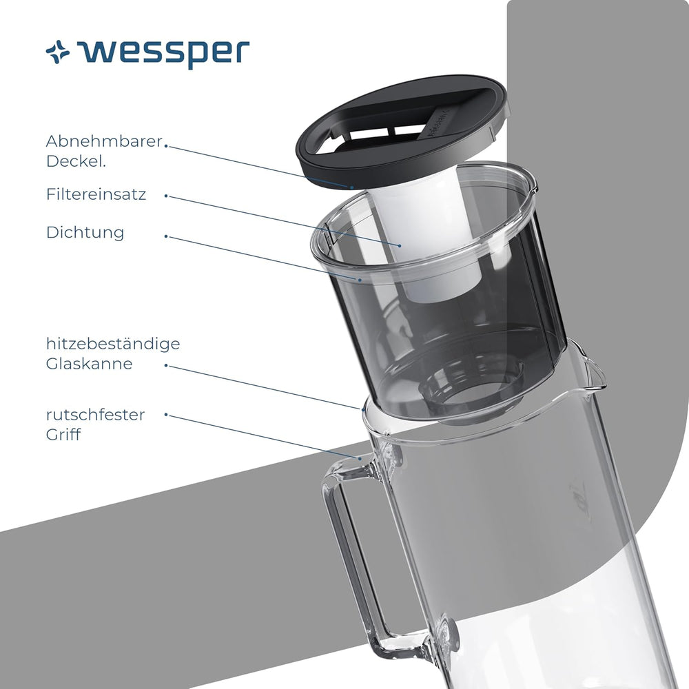 Wessper Wasserfilter Kanne Glas 2,5L Crystaline, Set Wasserkanne und 2 Filter AQUA CLASSIC, Wasserka
