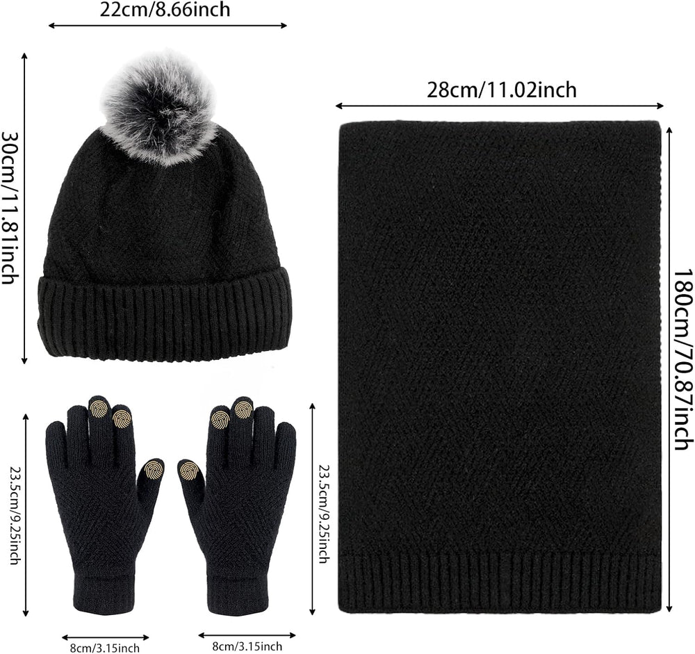 Damen Bommelmütze, Schals, Handschuhe, Set, Thermo, Winter, warm, Strickmütze, Halswärmer und Touchs