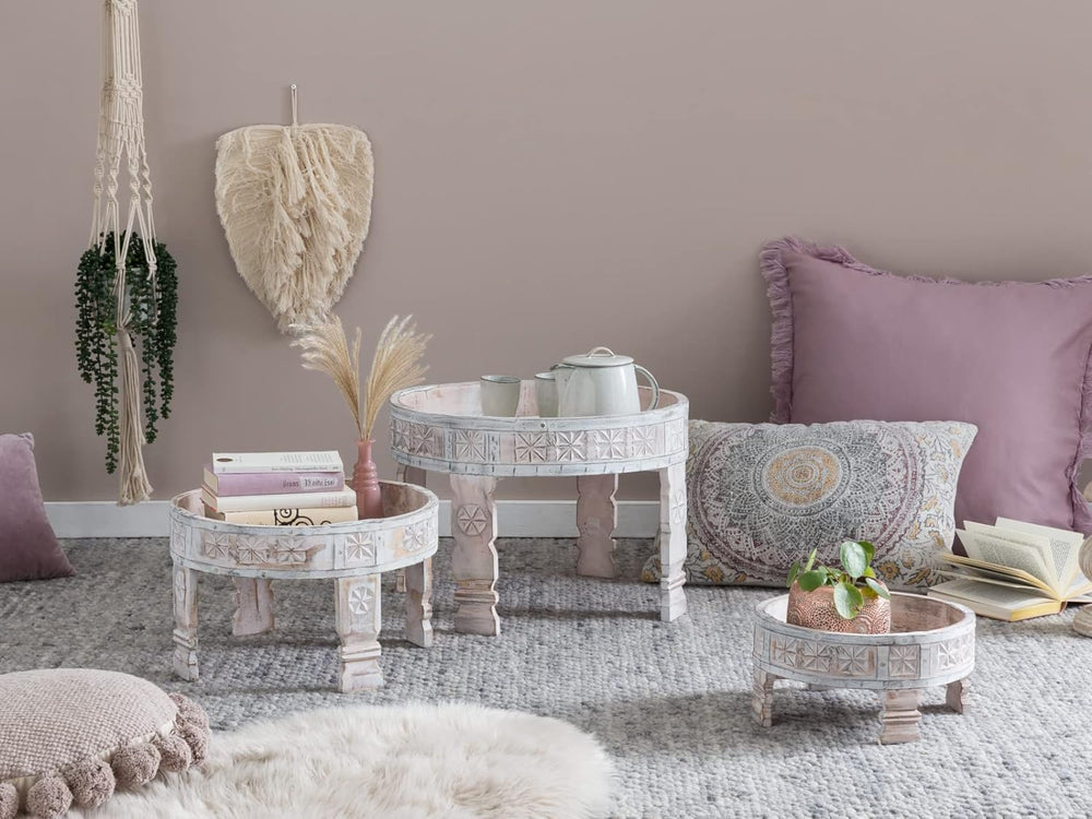Woodkings® 3er Set indische Beistelltische Chakki Mangoholz weiss geschnitzt Massivholz rustikal Ech