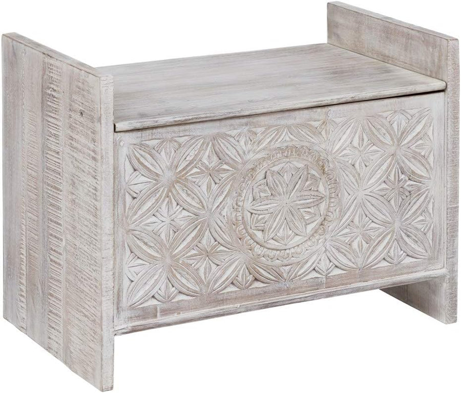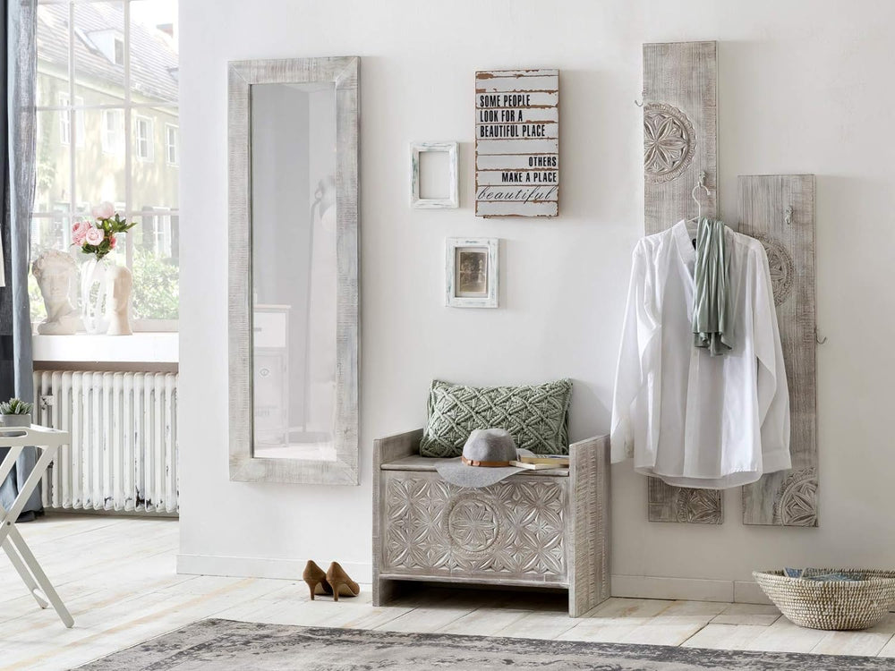 Woodkings® Sitzbank Mackay, Mangoholz massiv, Flurmöbel Vintage weiss, Schuhschrank, Truhe, Holzbank