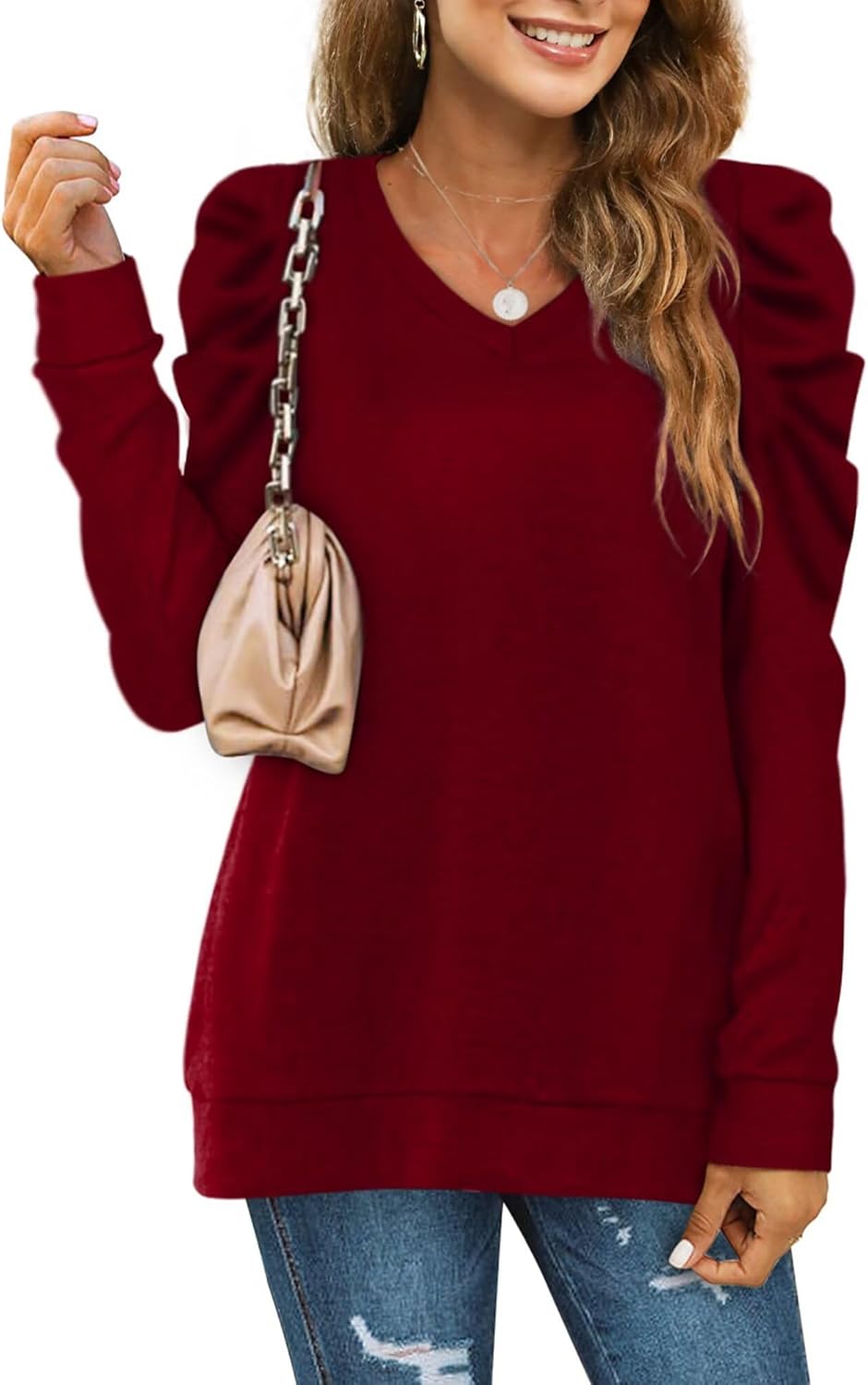 XIEERDUO Puffärmel Pullover Damen Herbst Sweatshirt Elegant V Ausschnitt Langarm Shirt Dunkelrot XL,
