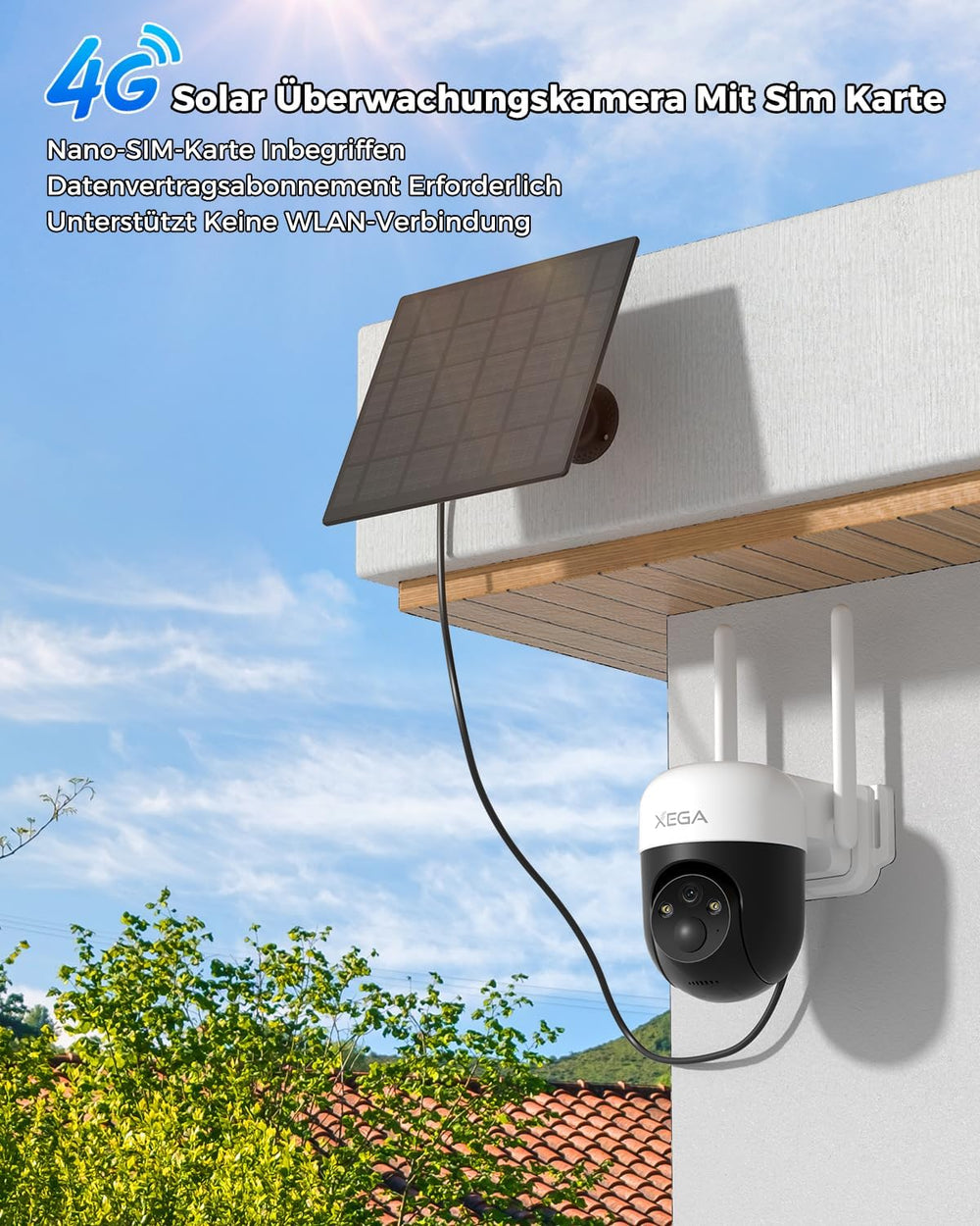 Xega 4G LTE Überwachungskamera Aussen Solar mit SIM Karte - 2K HD 3MP PTZ Kabellos Kamera Ohne WLAN