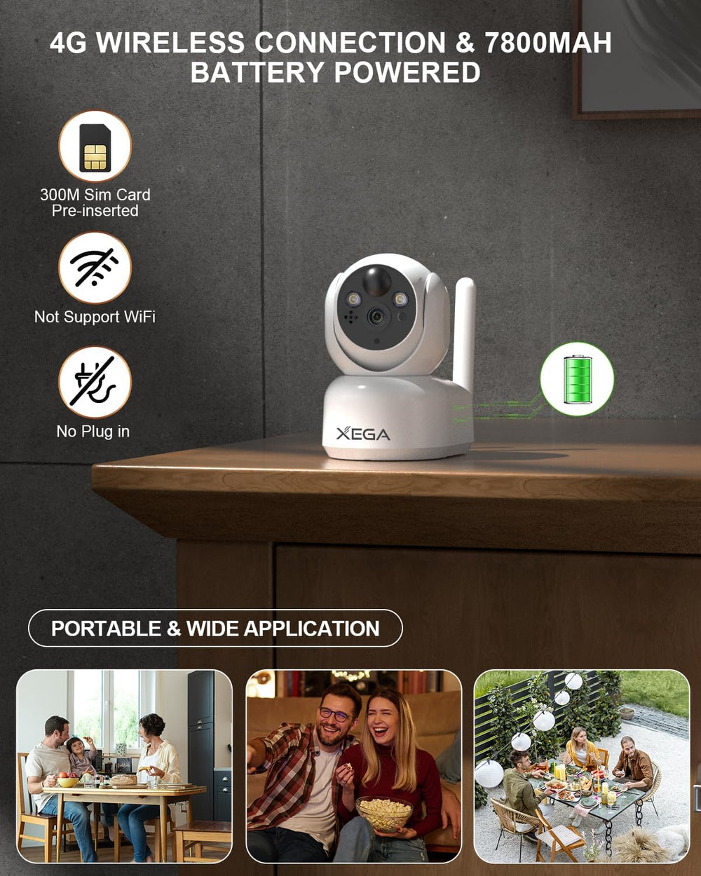 Xega 4G LTE Überwachungskamera Innen Akku mit SIM Karte, Ohne WLAN Kamera mit 7800mAh Batterie, 2K P