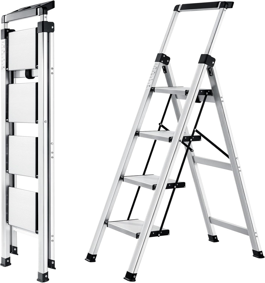 XinSunho Stufenleiter, Klapptritt 4 Stufen mit Ausziehbarem Handlauf, Aluminium Tritthocker, rutschf