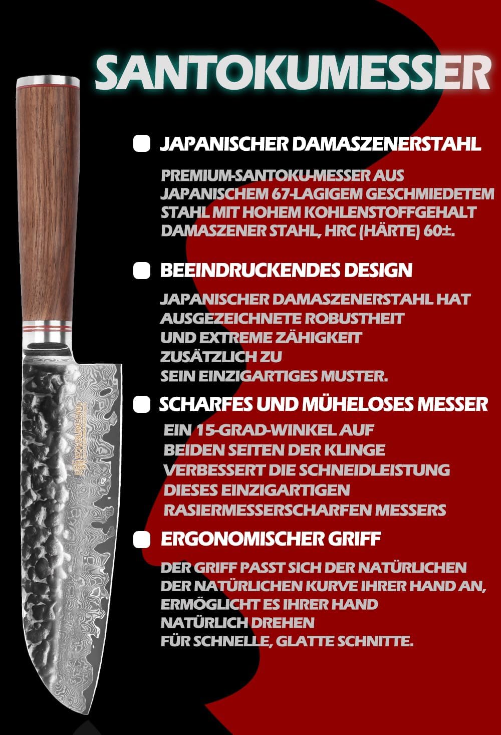 YOUSUNLONG Santoku Messer 7 Zoll (17.8cm) Kochmesser Japanischer gehämmerter Damaststahl Holzgriff a