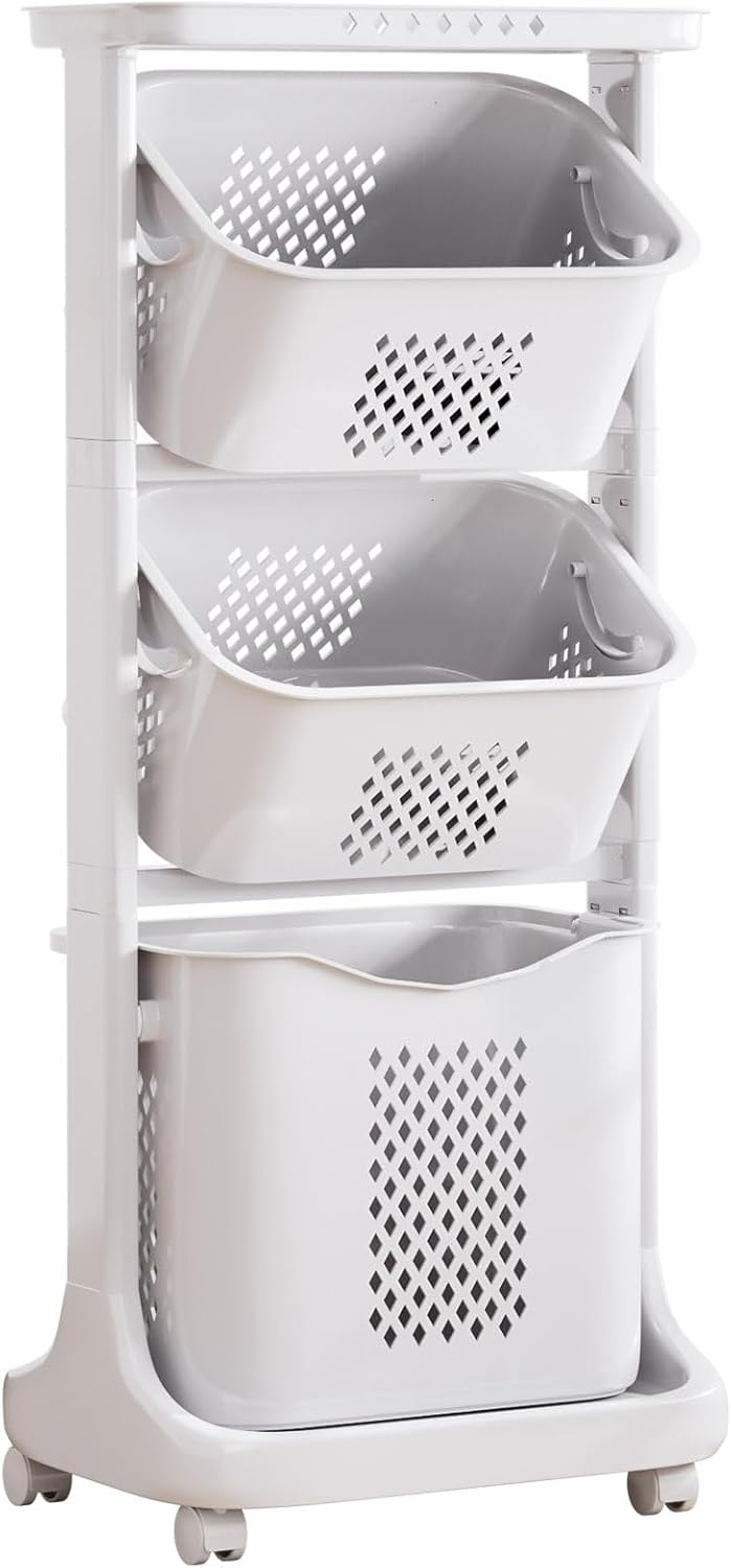 Yorbay Wäschekorb auf Rollen, Wäschesortierer mit 4 Stockwerke, 3 Aufbewahrungskörbe, Wäschesammler,