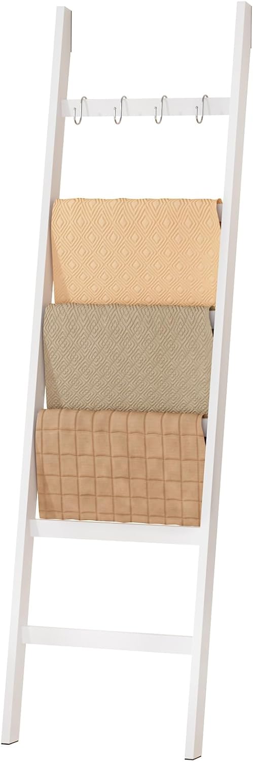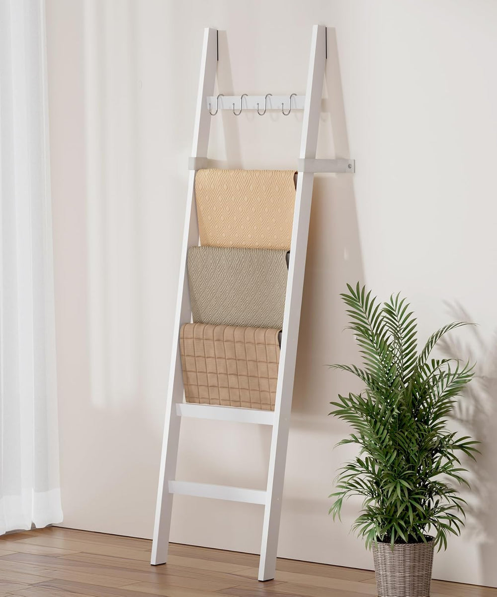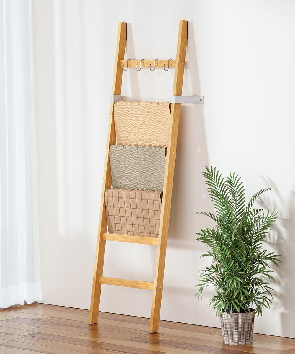 Yorbay Handtuchleiter Bambus, 6 Sprossen, Kleiderleiter mit 2 Sturzsicherheitsriemen und 4 Haken, Ha