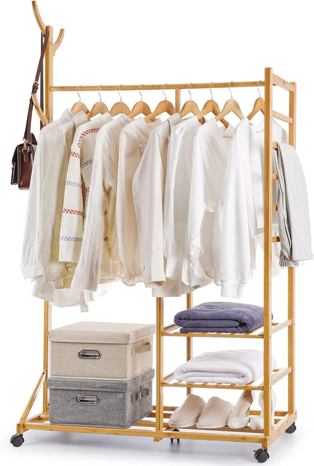 Yorbay Garderobenständer Bambus Kleiderständer mit Rollen, mit Kleiderstange, 3 Ablagen und 6 Haken,
