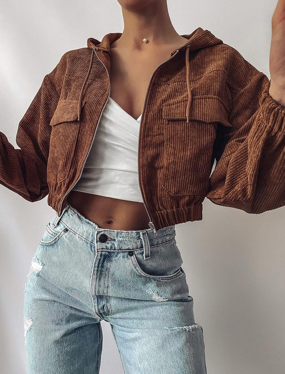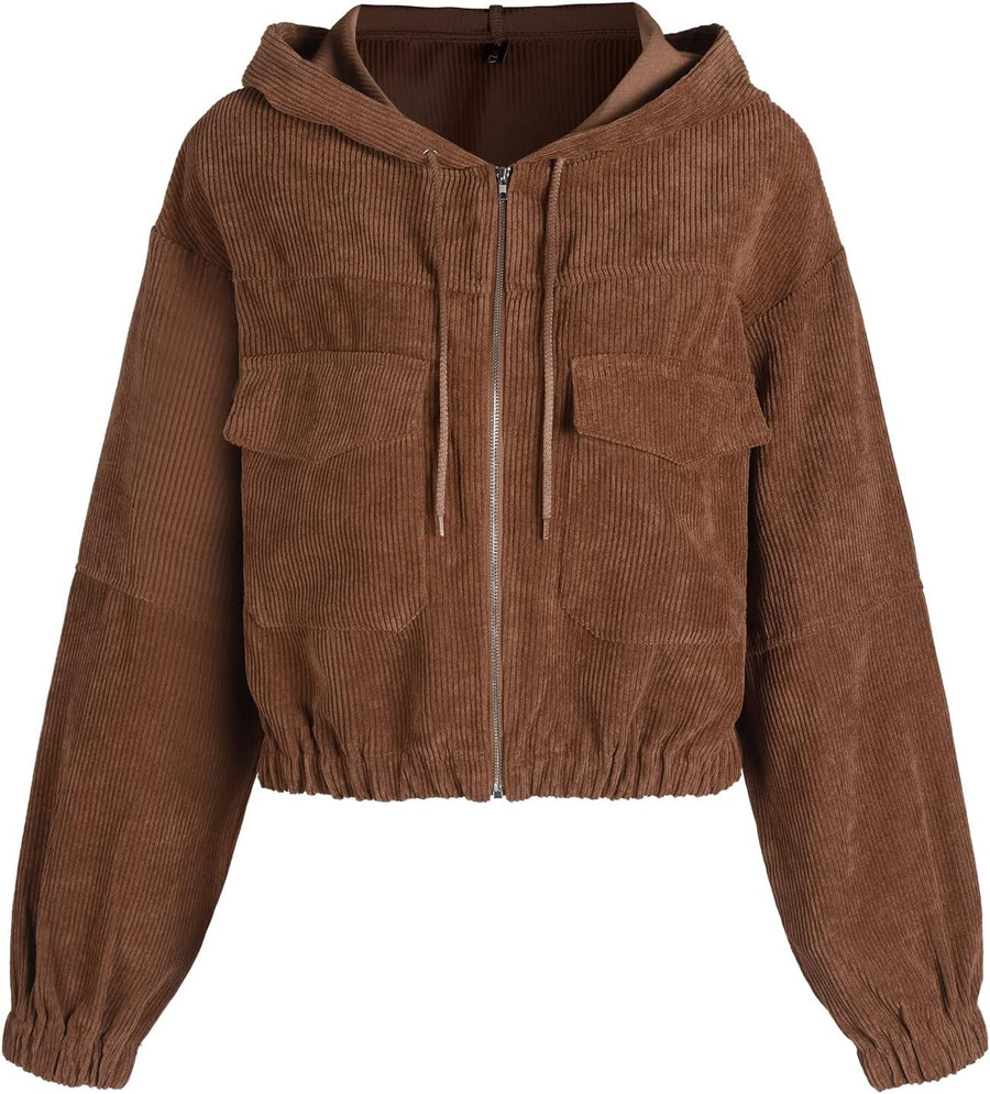 ZAFUL Damen Cordjacke College Vintage Kurze Hemdjacke Langarm Kapuze Coat Herbst mit Taschen S Braun