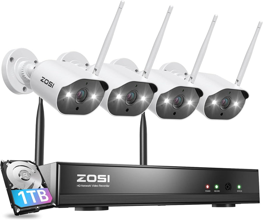 ZOSI 2K Aussen WLAN Überwachungskamera Set, 4X 3MP WiFi IP Kamera mit 8CH 5MP 1TB HDD NVR, 24/7 Vide