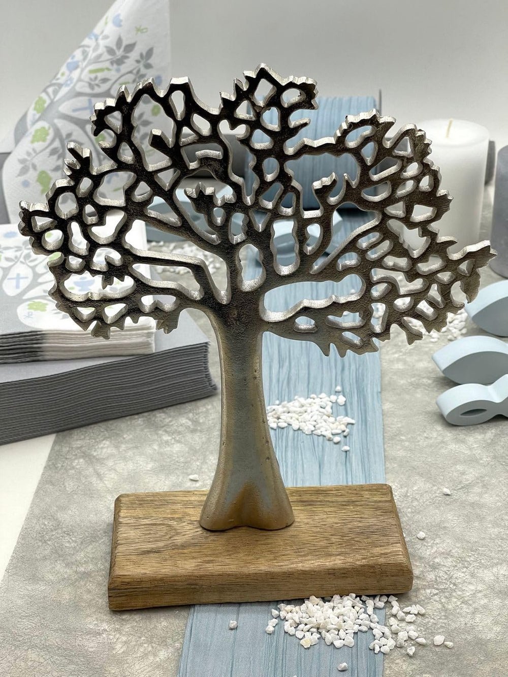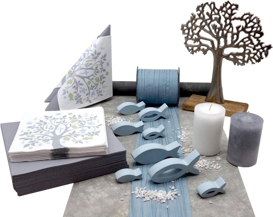 Tischdeko Kommunion Konfirmation Grau Taubenblau Fische Baum des Lebens SET 20 Personen
