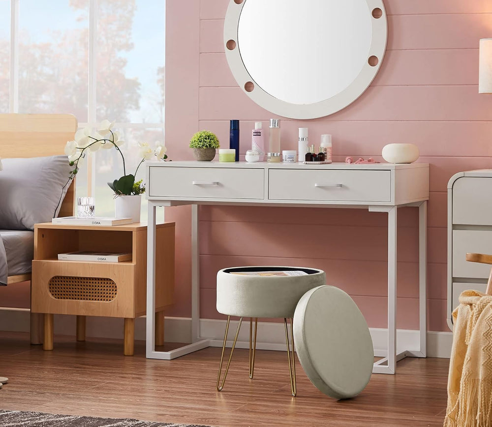 Zedelmaier Runder Sitzhocker Schminktisch Hocker Ottoman Gepolsterter Hocker Metallstütze Beige Beig