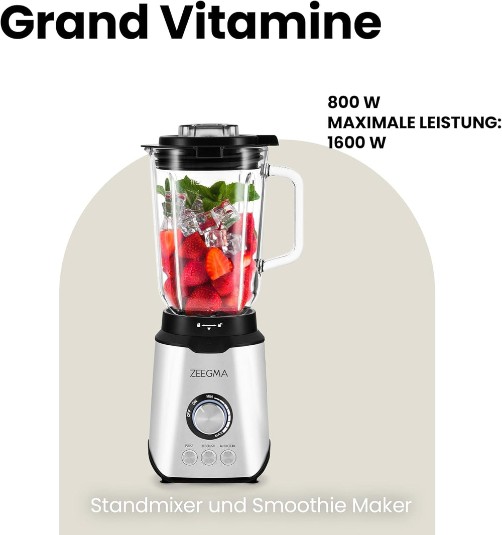 ZEEGMA Grand Vitamine Multifunktions-Standmixer 1600 W, Standmixer mit 1,7 l Glasbehälter, drei Auto