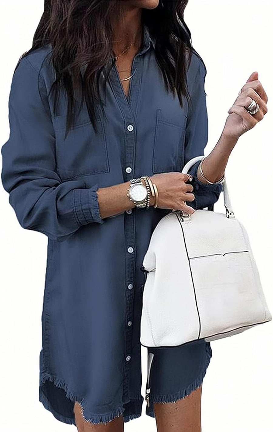 Zilcremo Damen V-Ausschnitt Blusenkleid Hemdkleid Jeanskleider Langarm Knopf Runter Shirtkleid Tunik