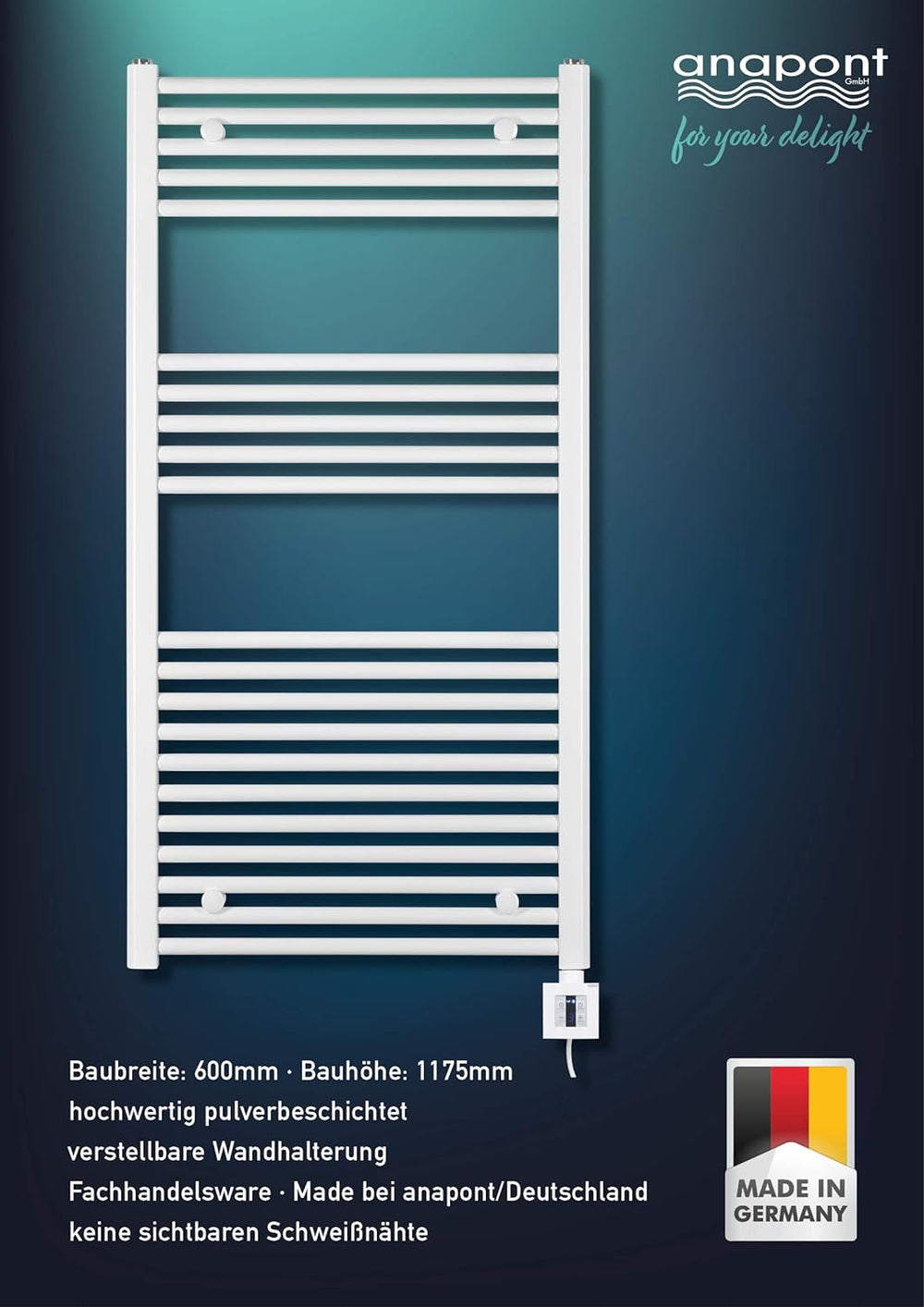 anapont elektrischer Badheizkörper 1175x400 - weiss gerade - Timer-Funktion - Handtuchheizkörper - B