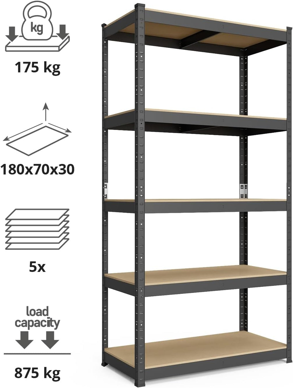 baudim - 180x60x40cm Schwerlastregal/Steckregal schwarz/antrazit mit 5 Böden und 175kg Tragkraft, Me