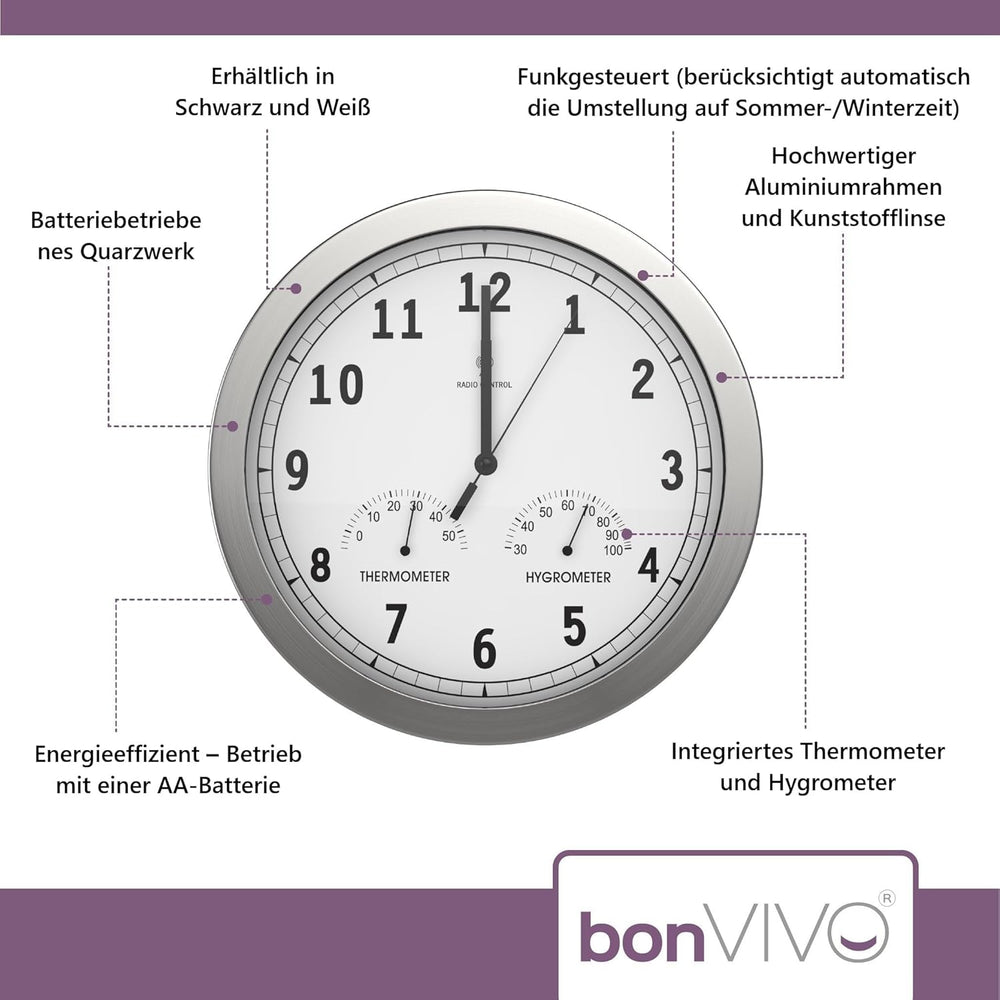 bonVIVO Funk Wanduhr ohne Tickgeräusche - Grosse Küchenuhr - Funkuhr für Wand in Bad, Büro, Home Off