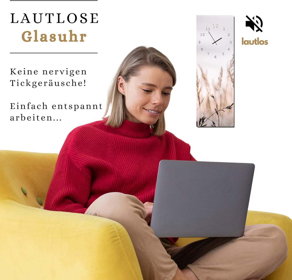 Wanduhr Calm Grasses 20 x 60 cm | lautlose Uhr aus Glas Made in EU - Glasuhr inklusive Wandaufhängun